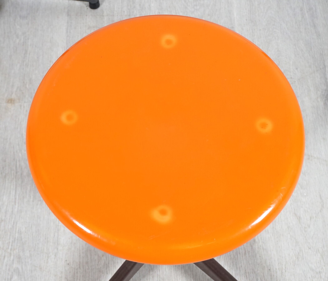 Suite de trois tabourets à hauteur réglable, piètement quadripode en métal, deux laqués gris, l'un laqué marron, assise en PVC orange, H. 43 cm (petites rayures d'usage).