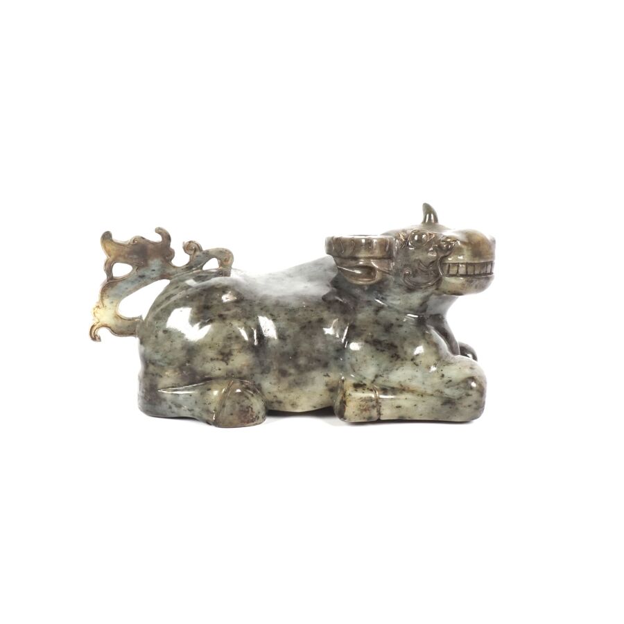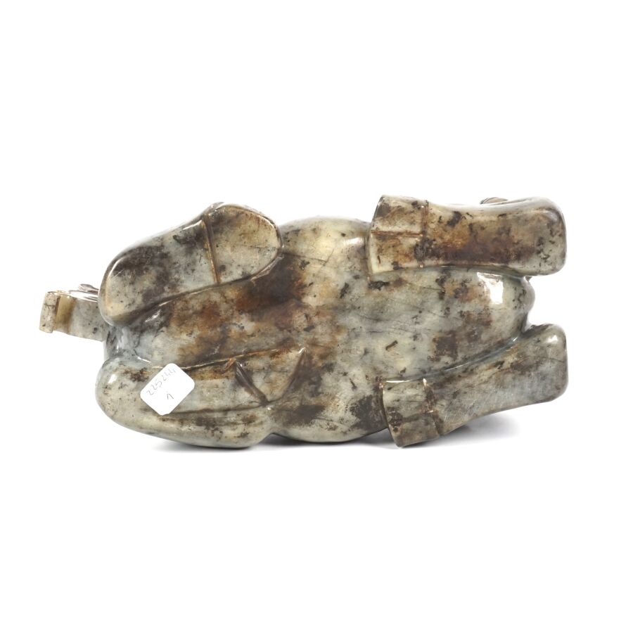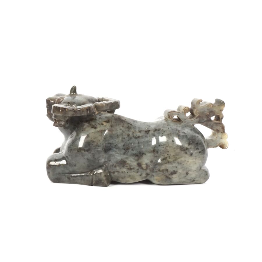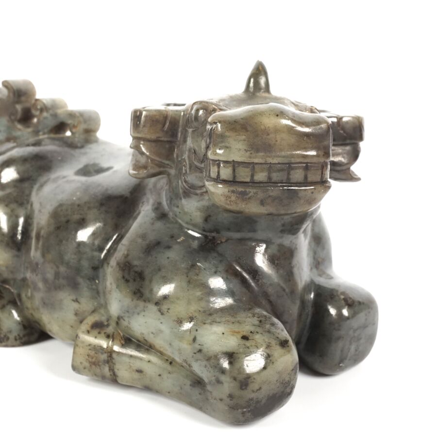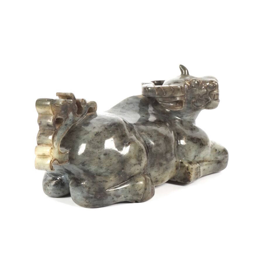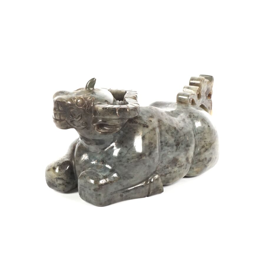 Sujet en serpentine grise représentant un buffle couché, Chine, 20ème siècle, H. 13 cm. L. 24 cm.