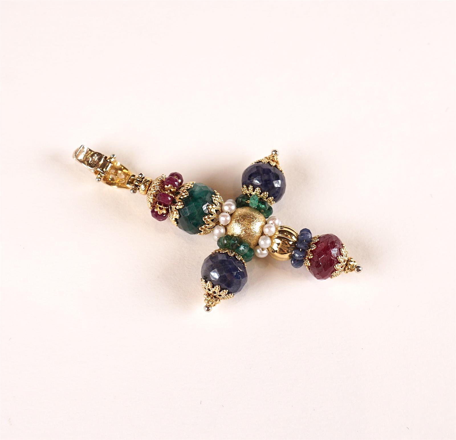 SUNDAY Italy : Croix baroque en or jaune 18 K (750/oo) ornée de perles facettées d'émeraudes, de rubis et de saphirs, agrémentées de perles baroques, H. 6.5 cm. Poids brut : 18.83 g environ. *