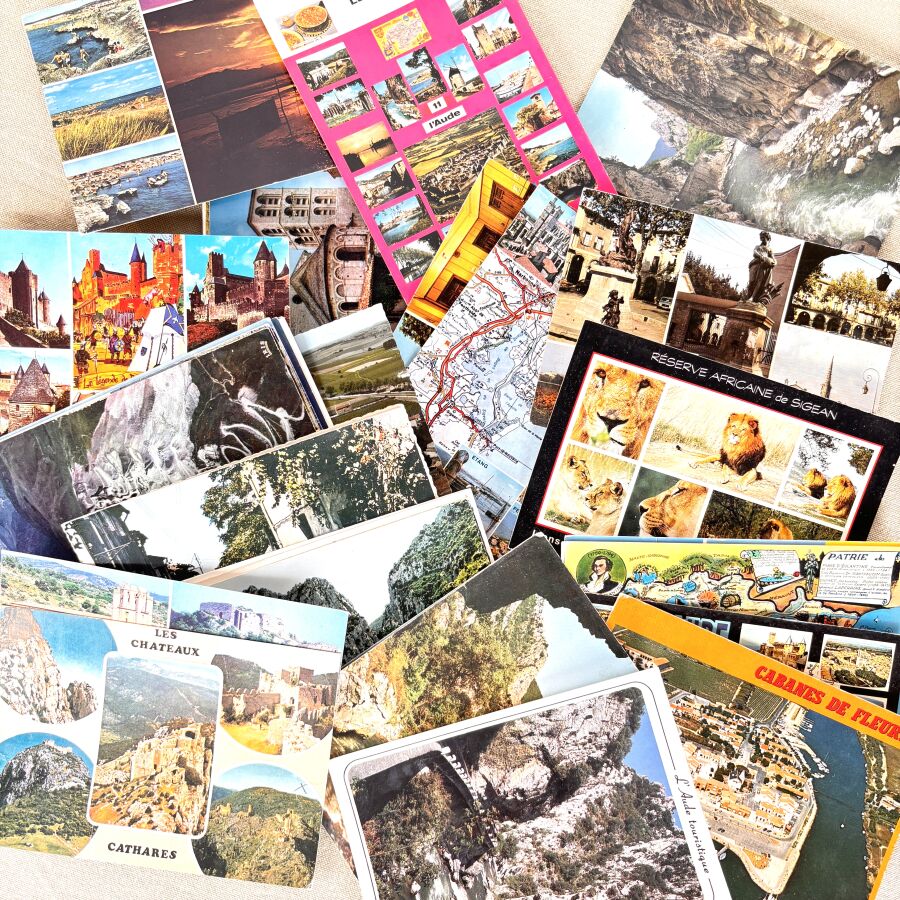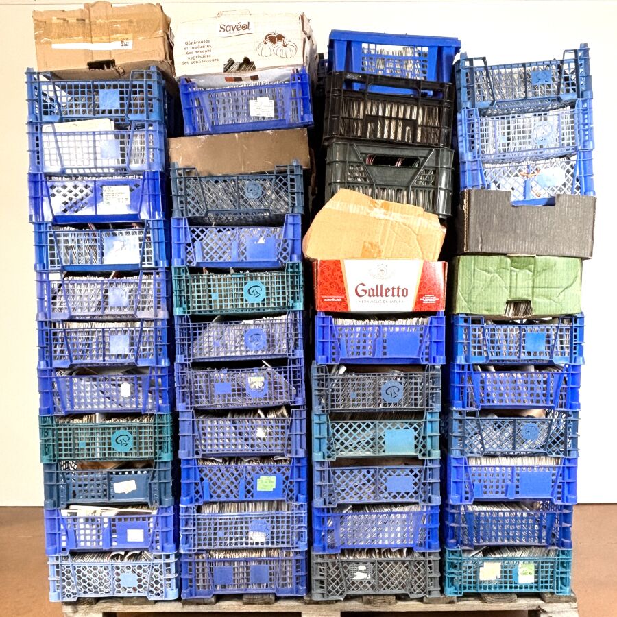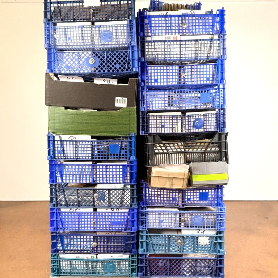 Sur une palette, ensemble de CPA, CPSM, CPM dans 90 petites caisses, classées par département, largement plus de 100 000 cartes.