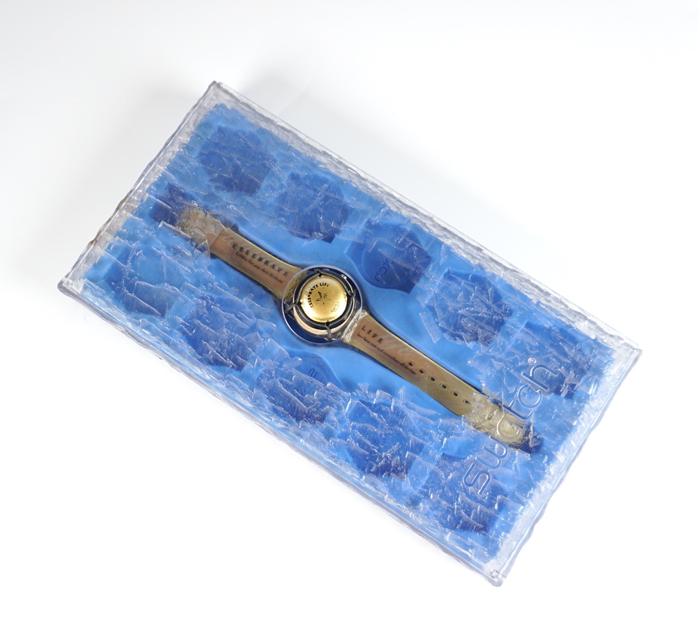 SWATCH : Montre "Celebrate life", le cadran surmonté d'un bouchon de Champagne, water resistant, édition limitée Christmas 98 (écritures sur le bouchon en partie effacées). Présentée dans un écrin en plexi transparent, le support bleu formant moule à glaçons.