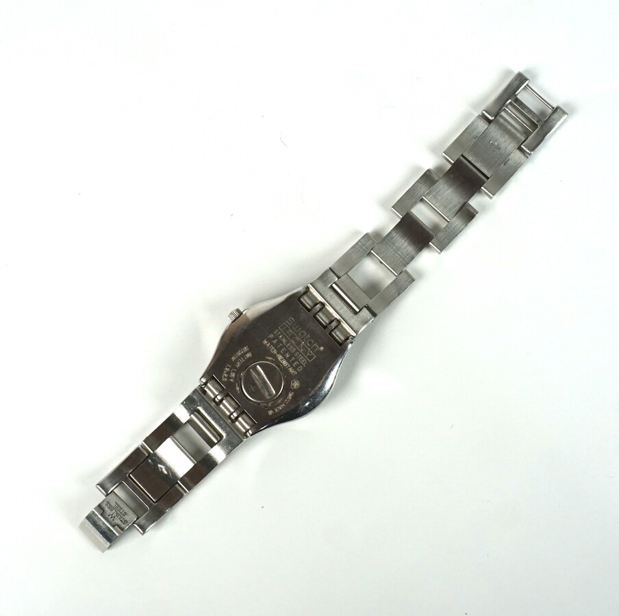 SWATCH : Montre en acier cadran 34 mm, fond bleu à index, mouvement à quartz, bracelet articulé ajouré, fermoir à clapet. Tour de poignet : 16.5 cm.