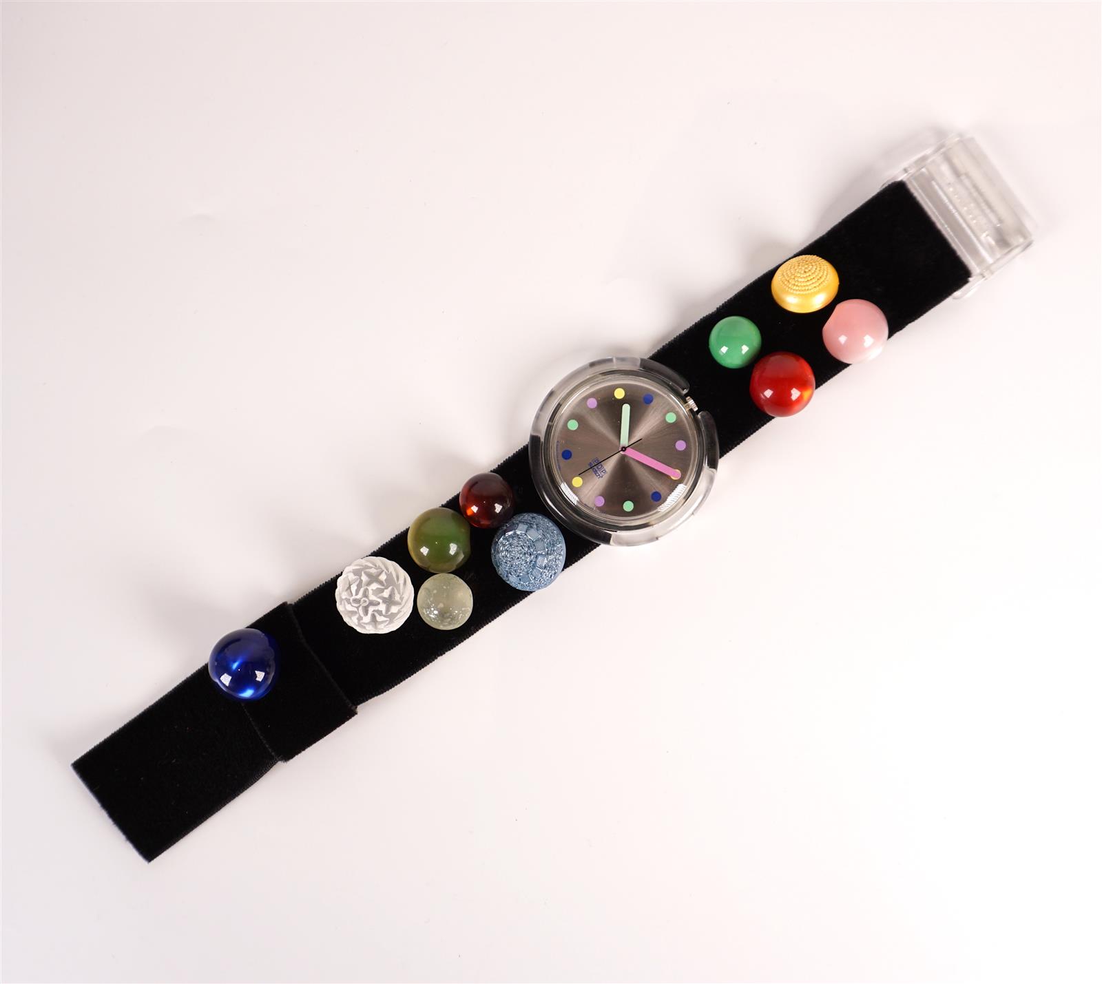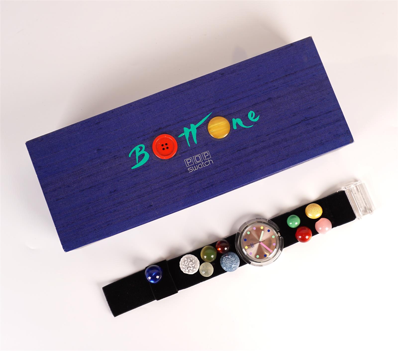 SWATCH : Montre Pop "Bottone", bracelet coulissant velours noir orné de boutons, présentée dans un coffret bleu.