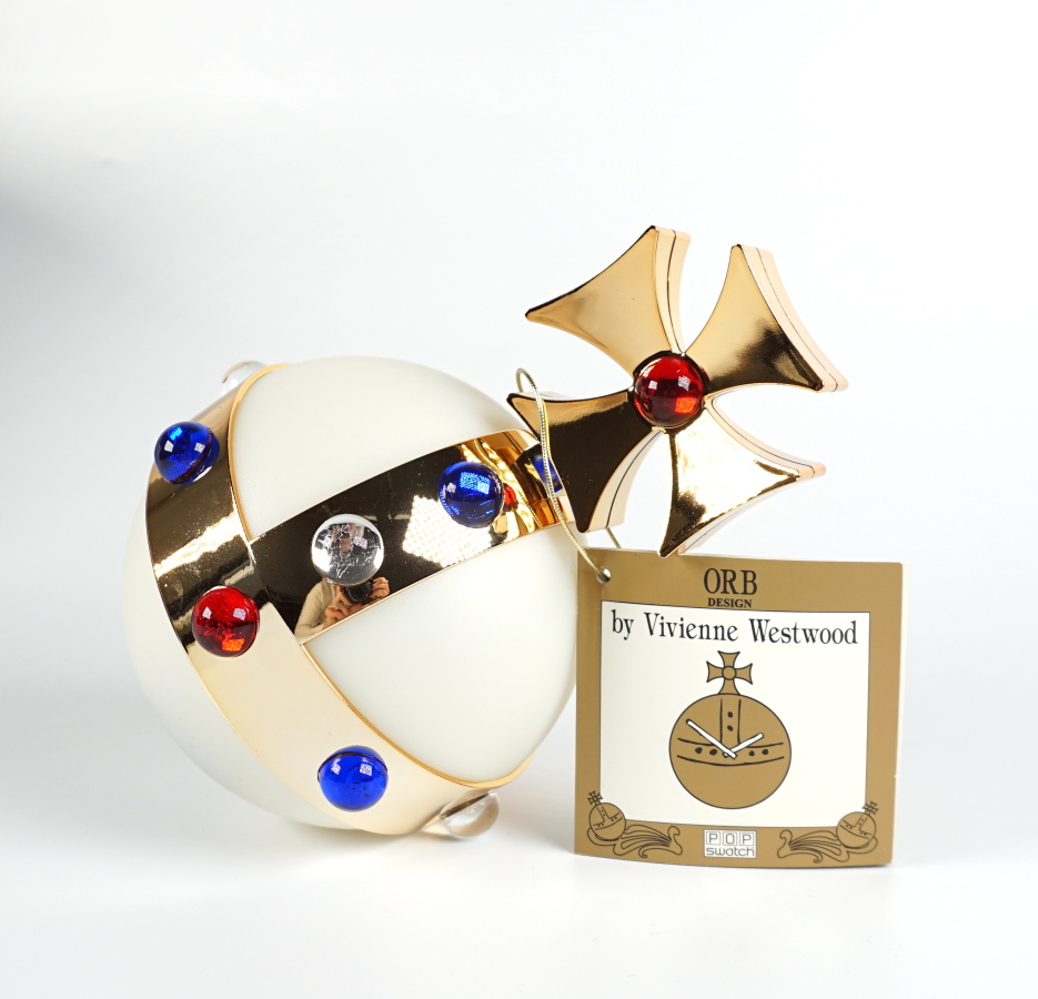 SWATCH : Montre Pop "by Vivienne Westwood", bracelet façon velours noir. Présentée dans une boule à décor de pastilles colorées et surmontée d'une croix.