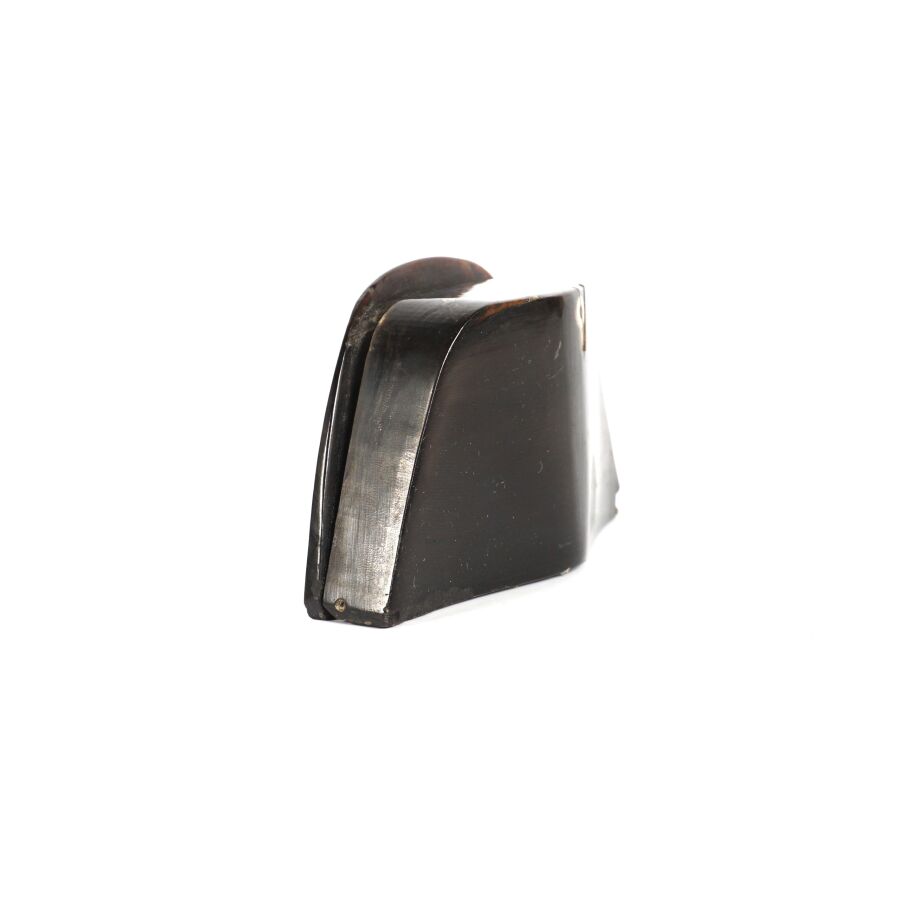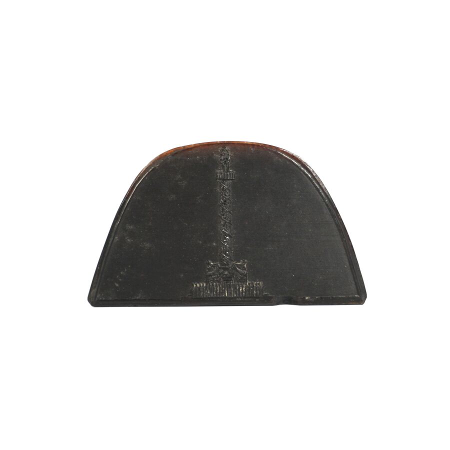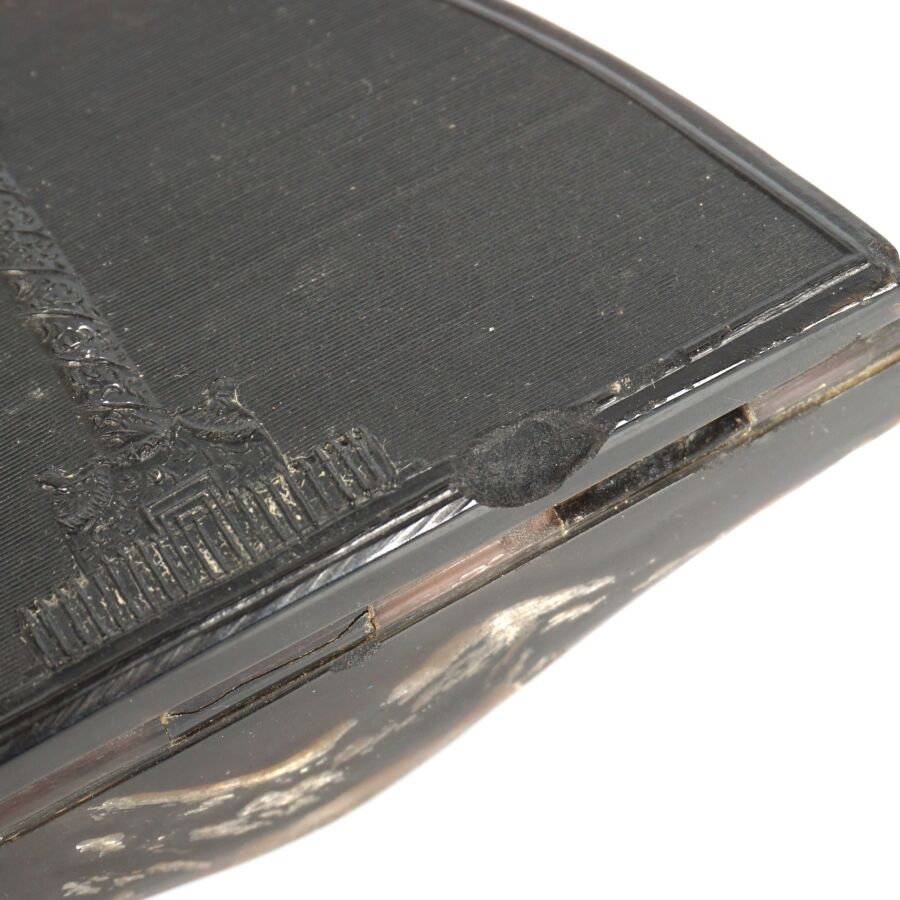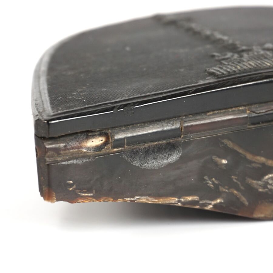 TABATIERE en corne noire figurant le BICORNE DE L'EMPEREUR avec au dos la COLONNE VENDOME, cocarde en os, 4,4 x 8,3 x 2,6 cm, début XIXème, BE (Légers accidents et manques).