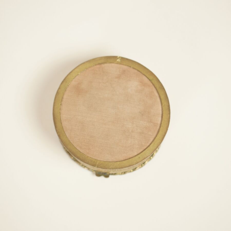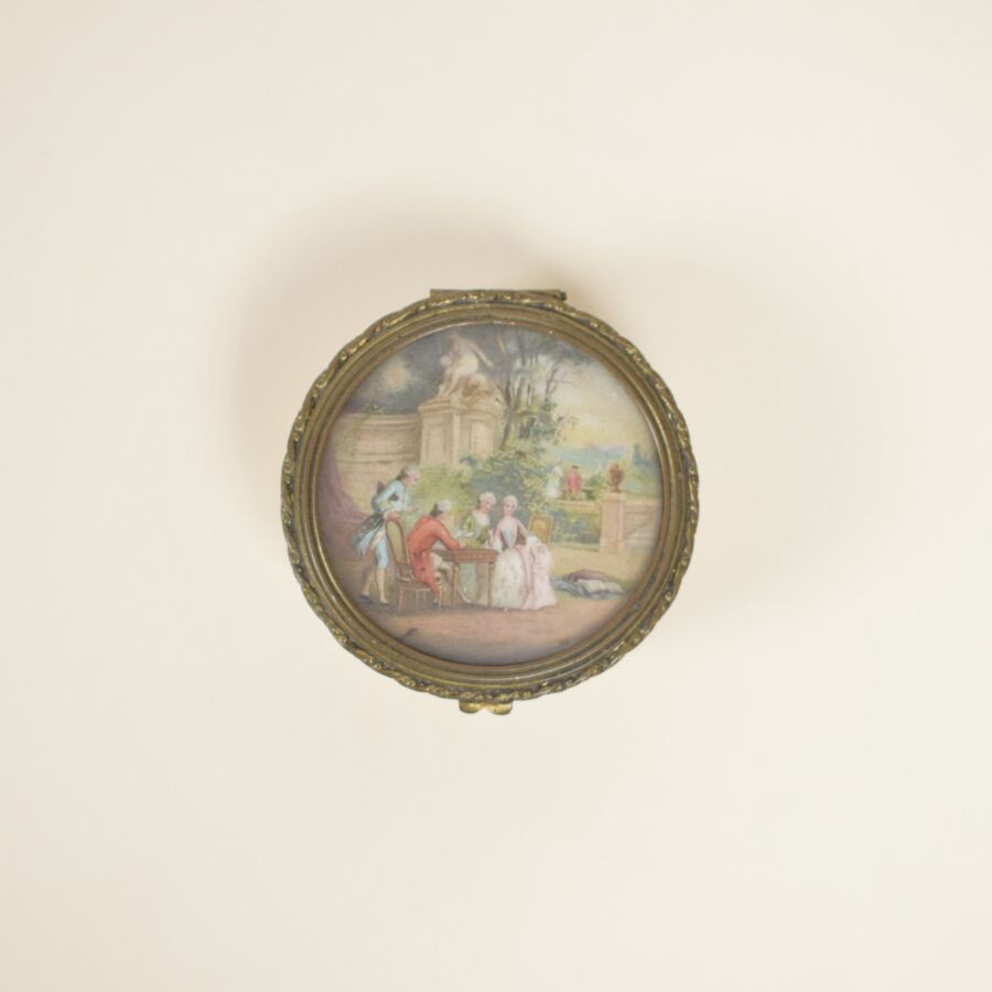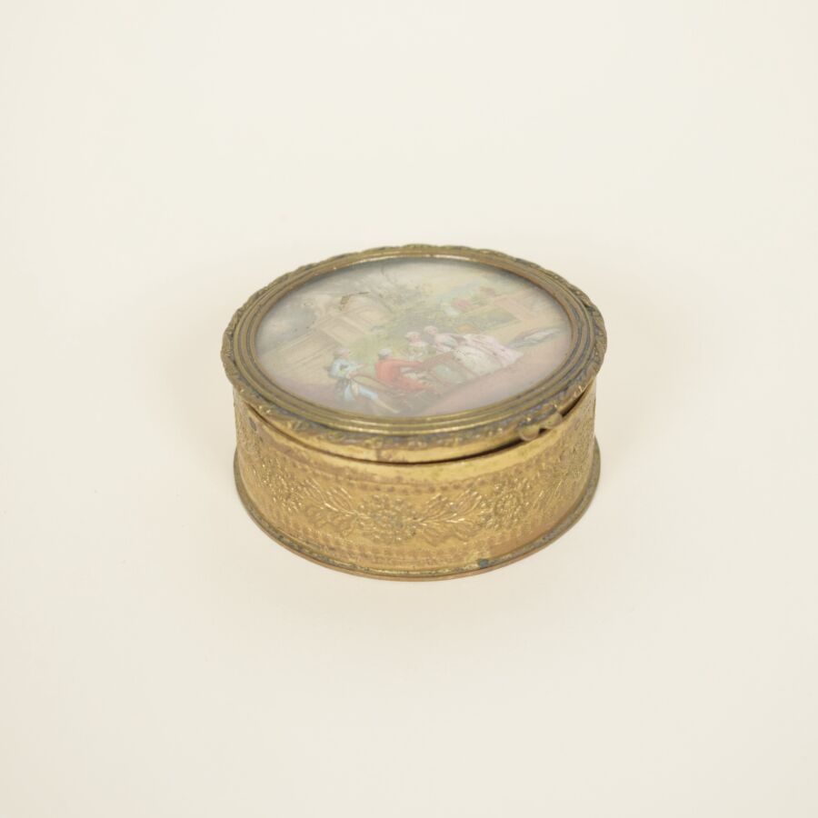 Tabatière ronde en bronze doré, ornée sur le couvercle d'un décor de scène galante dans le goût du 18ème siècle, travail du 18ème siècle, 2.1 x 6.2 cm