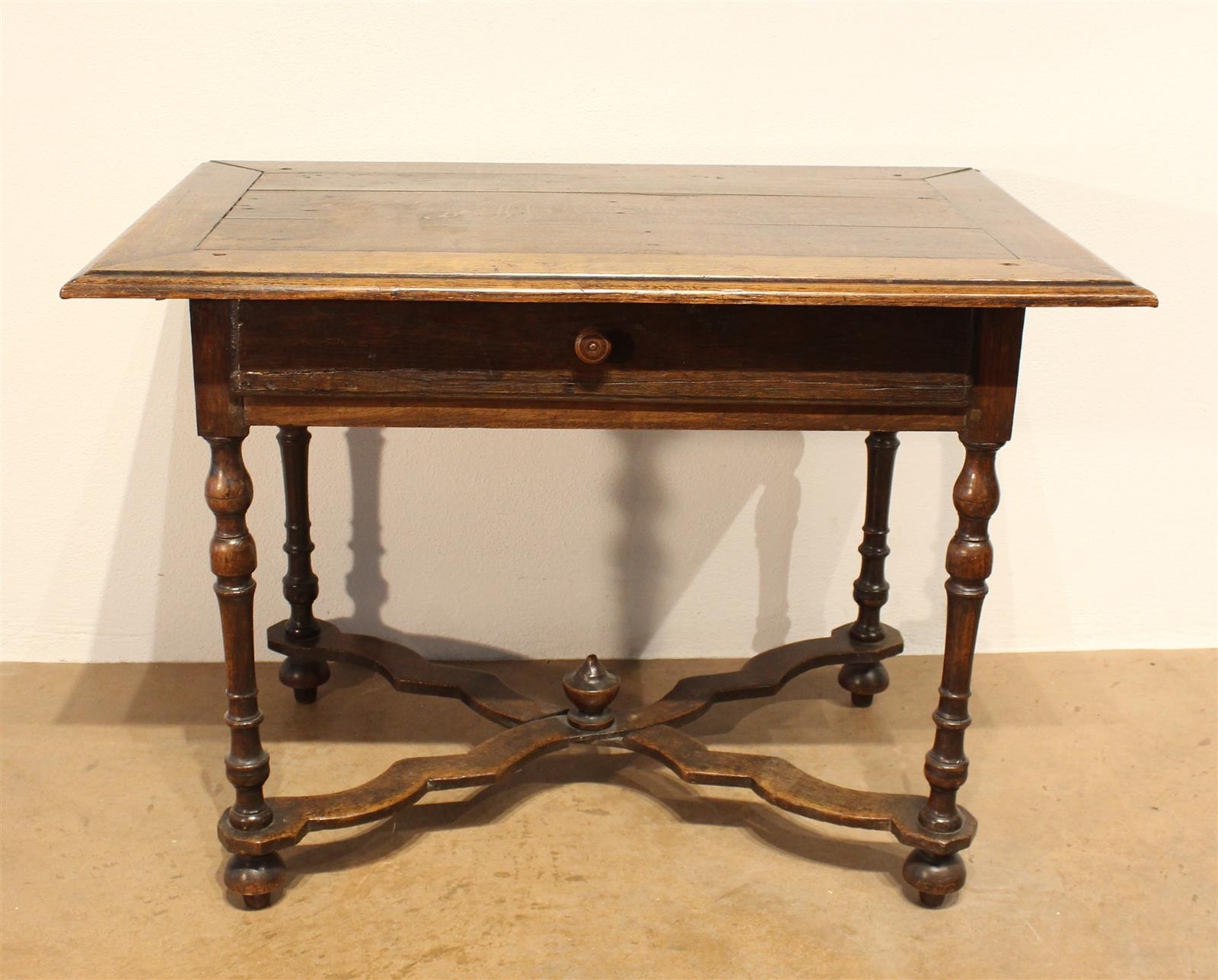 Table à écrire style Louis XIII en chêne, ouvrant à un tiroir en ceinture, piétement tourné relié par une entretoise en X mouvementée, 60 x 102 x H. 71.5 cm