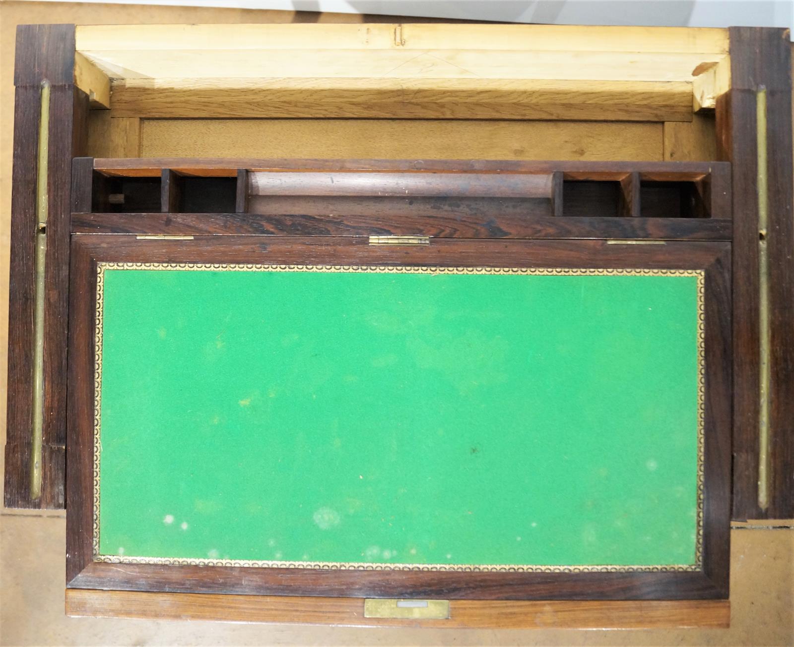 Table à jeux à système de style Louis XVI, plateau pivotant pouvant former coiffeuse et écritoire, à décor de marqueterie en croisillons et filets de bois clair, 4 pieds fuselés cannelés, époque Napoléon III, 70 x 45 x H. 78 cm (baguettes à recoller).