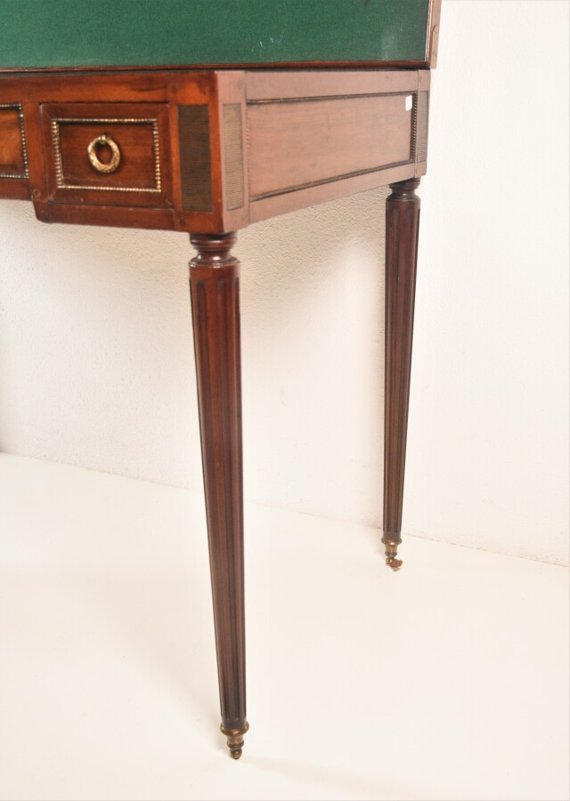 Table à jeux de style Louis XVI, la ceinture ouvrant à un tiroir latéral de chaque côté et agrémenté d'un second aveugle, plateau amovible à décor de damier, ornementation de bronze doré dont poignées de tirage à motif de couronne de laurier et frise perlée, piétement cannelé et fuselé terminant par des pieds "toupie" en bronze doré, 112 x 57 x H. 75 cm.