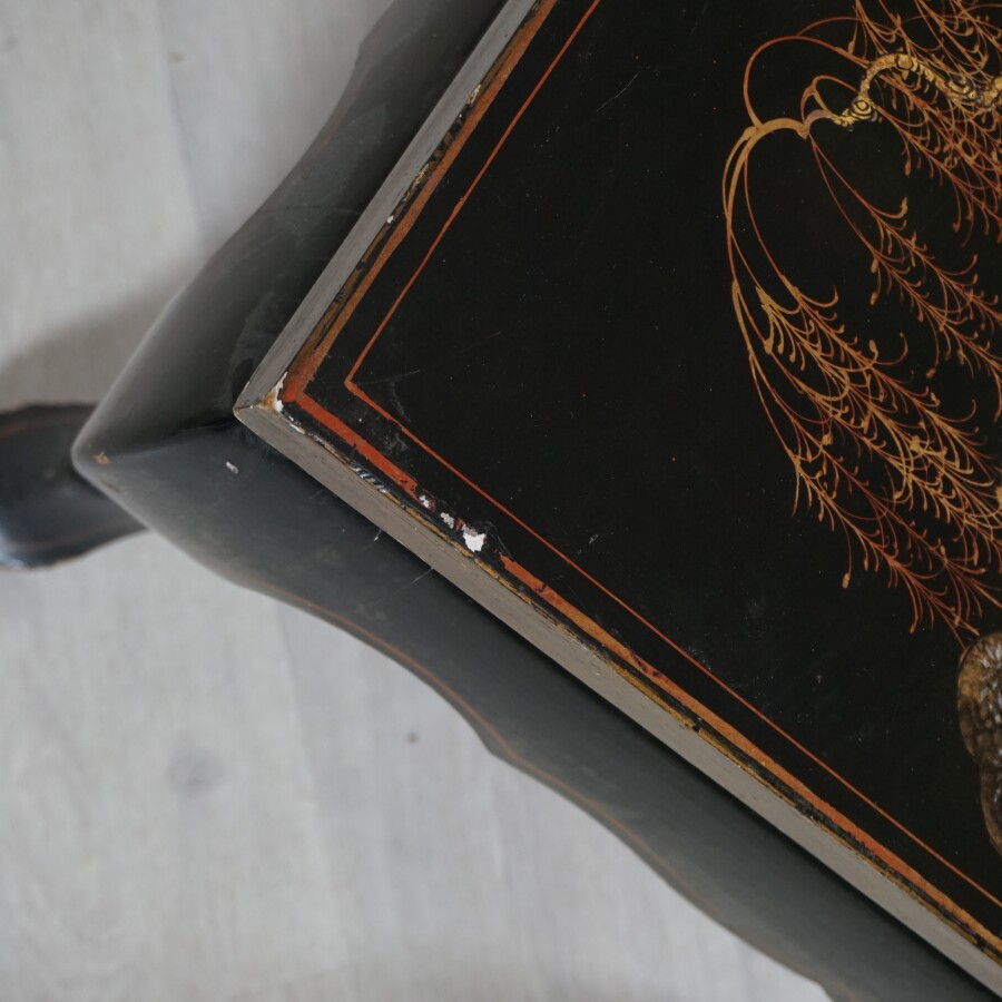 Table basse à décor dans le plateau de laque brun - rouge - or sur fond noir et application de nacre décrivant une scène d'un concours d'archers devant un dignitaire, Chine, 20ème, circa 1930, H. 37 cm. L. 149 cm. P. 48 cm (quelques usures).
