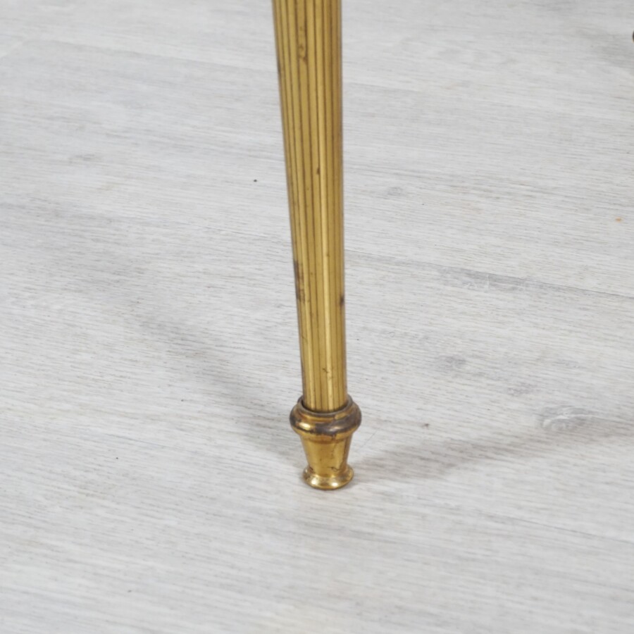 Table basse de forme ronde, plateau en onyx, reposant sur un piètement en métal doré, la ceinture à décor ciselé de rose et feuillage, quatre pieds cannelés, 20ème siècle, H. 45 cm. Diam : 63 cm.