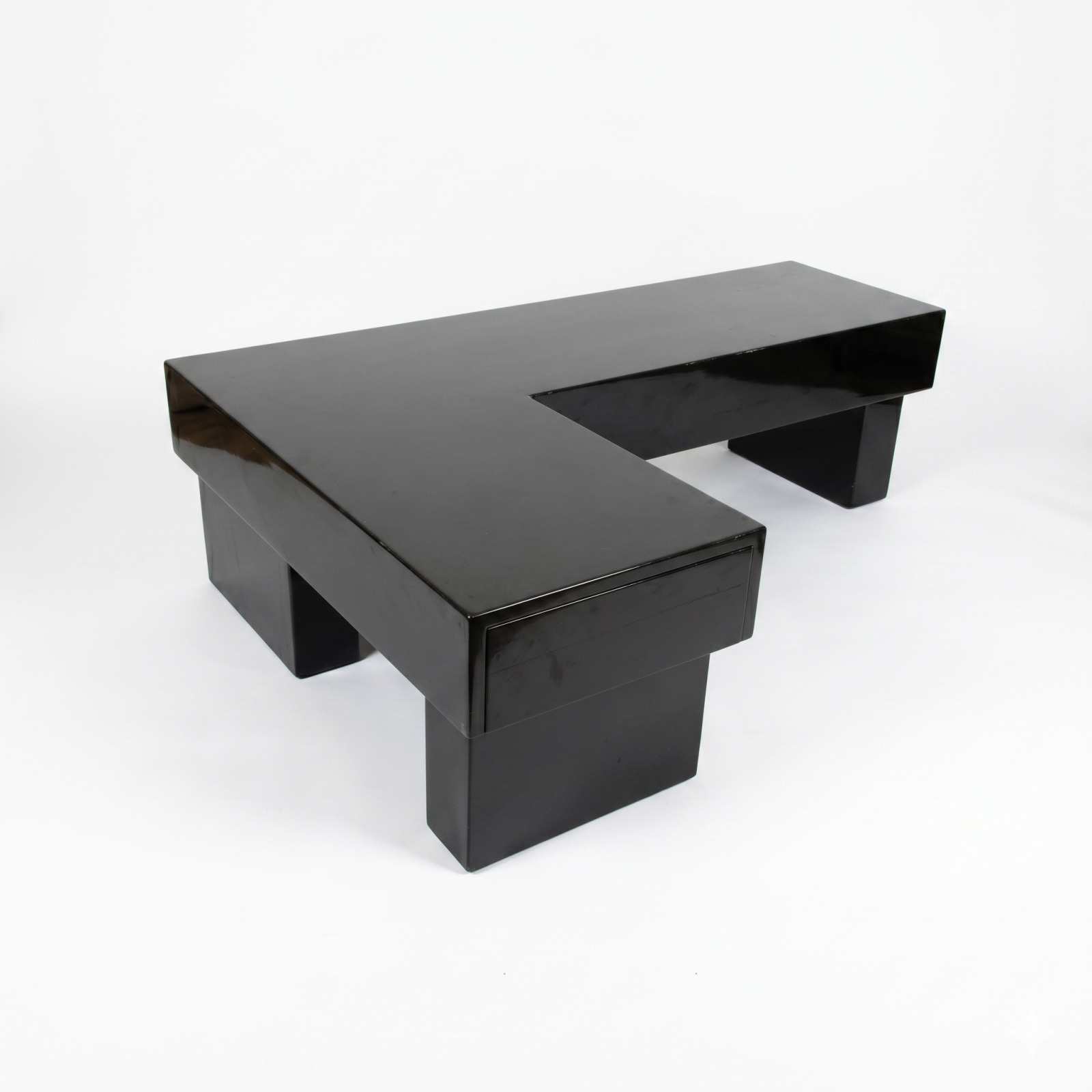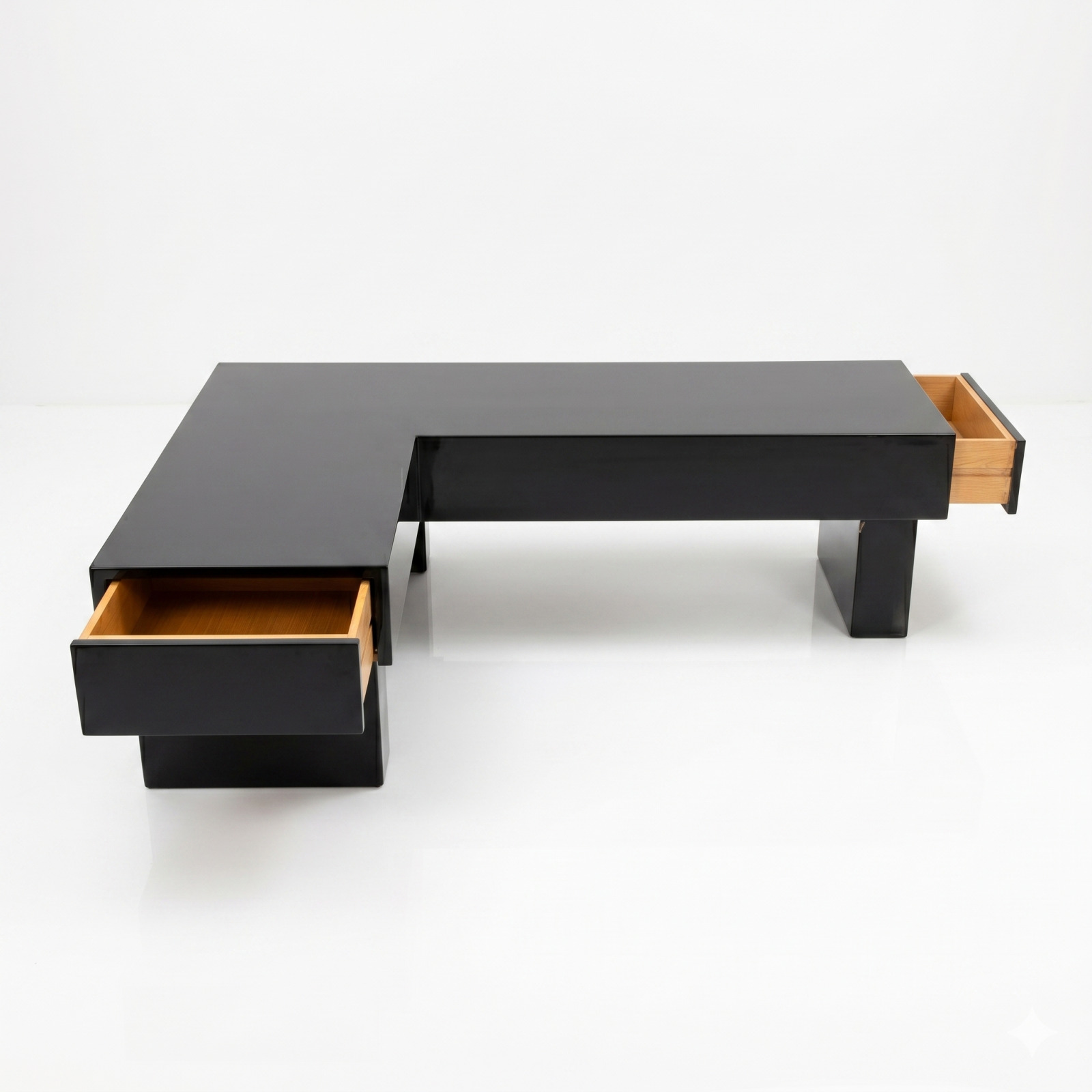 Table basse de style moderne, à structure en L, en matériau composite à revêtement noir, reposant sur trois piètements modulables repliables, 37.5 x 130 x 90 cm.