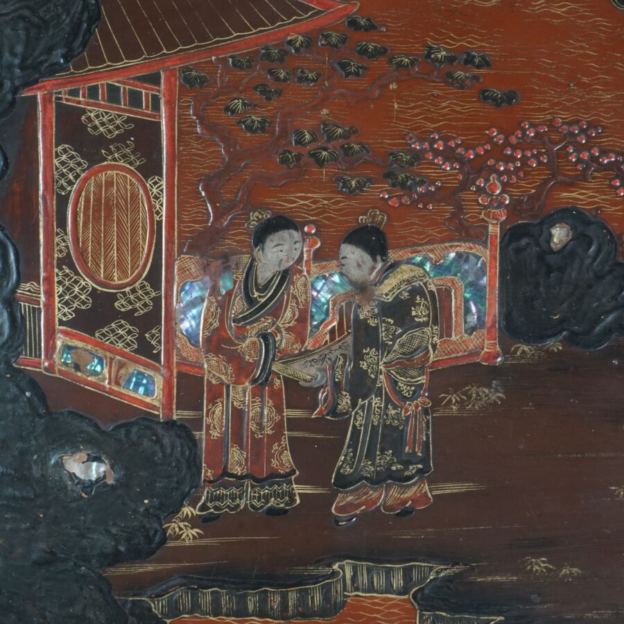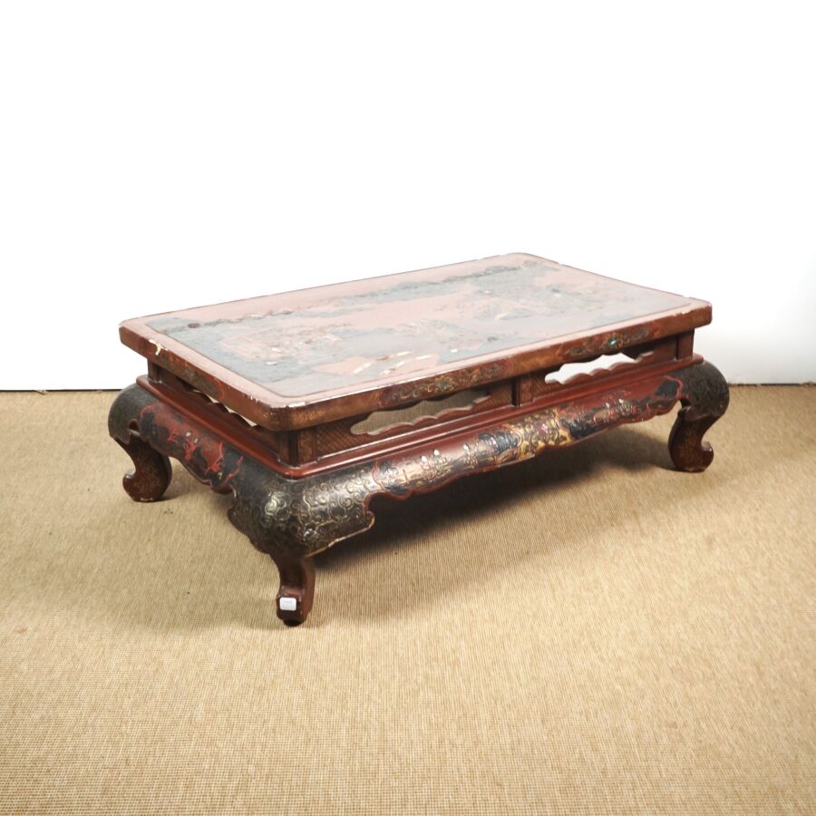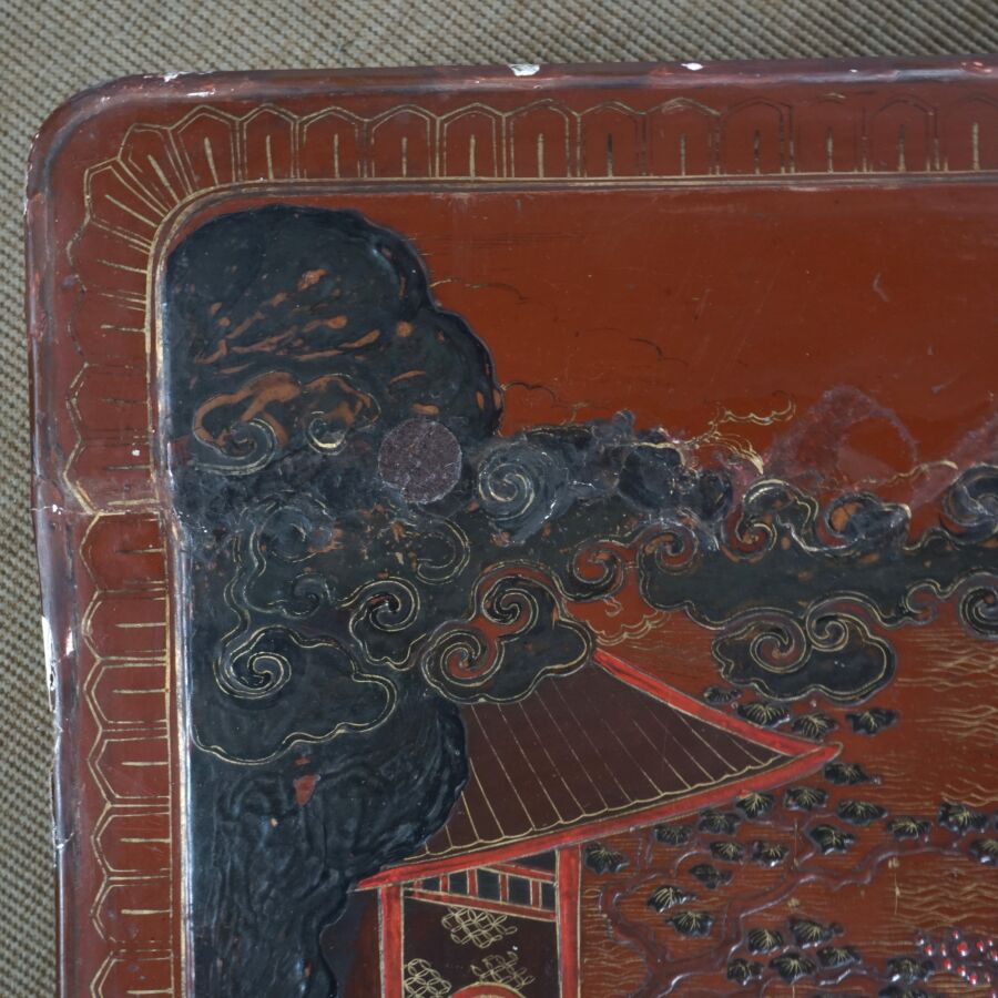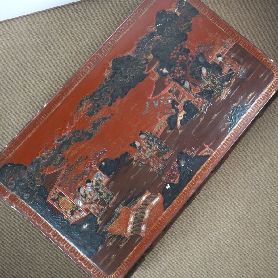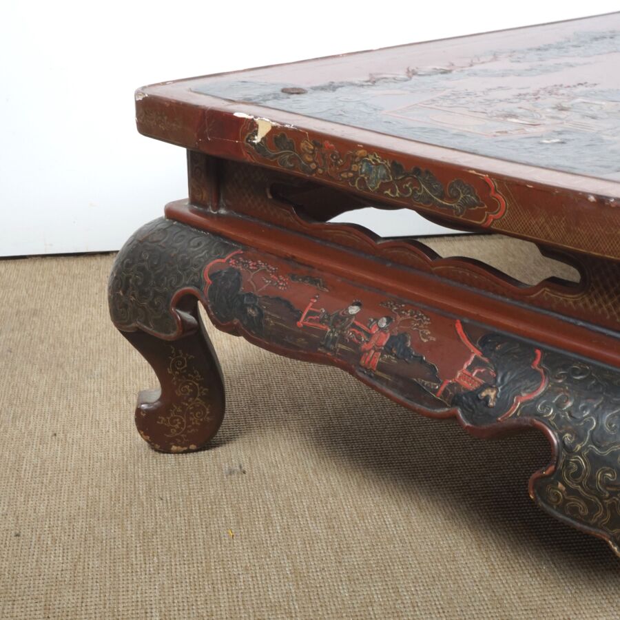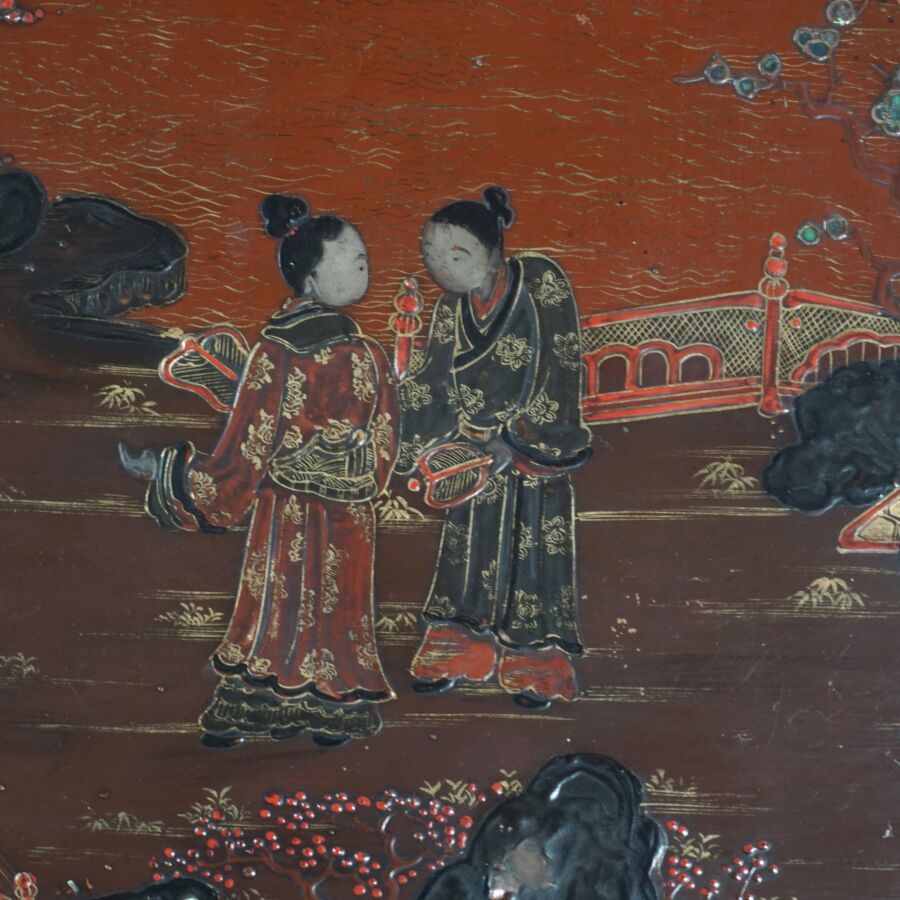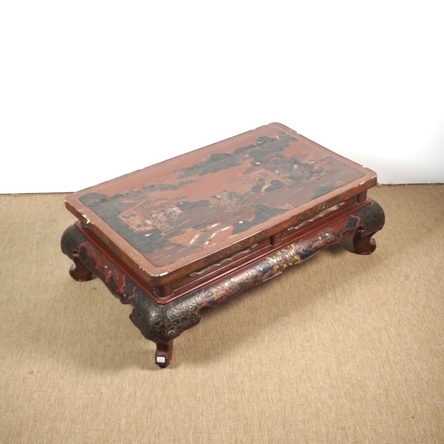 Table basse en bois laqué brun, rouge et rehauts d'or, à décor de jeunes femmes conversant sur une terrasse arborée aux abords de pagodons, Japon, circa 1900, Dim. 31.5 x 93 x 58.5 cm (accidents et manques, élément collé sur le laque sur le plateau).