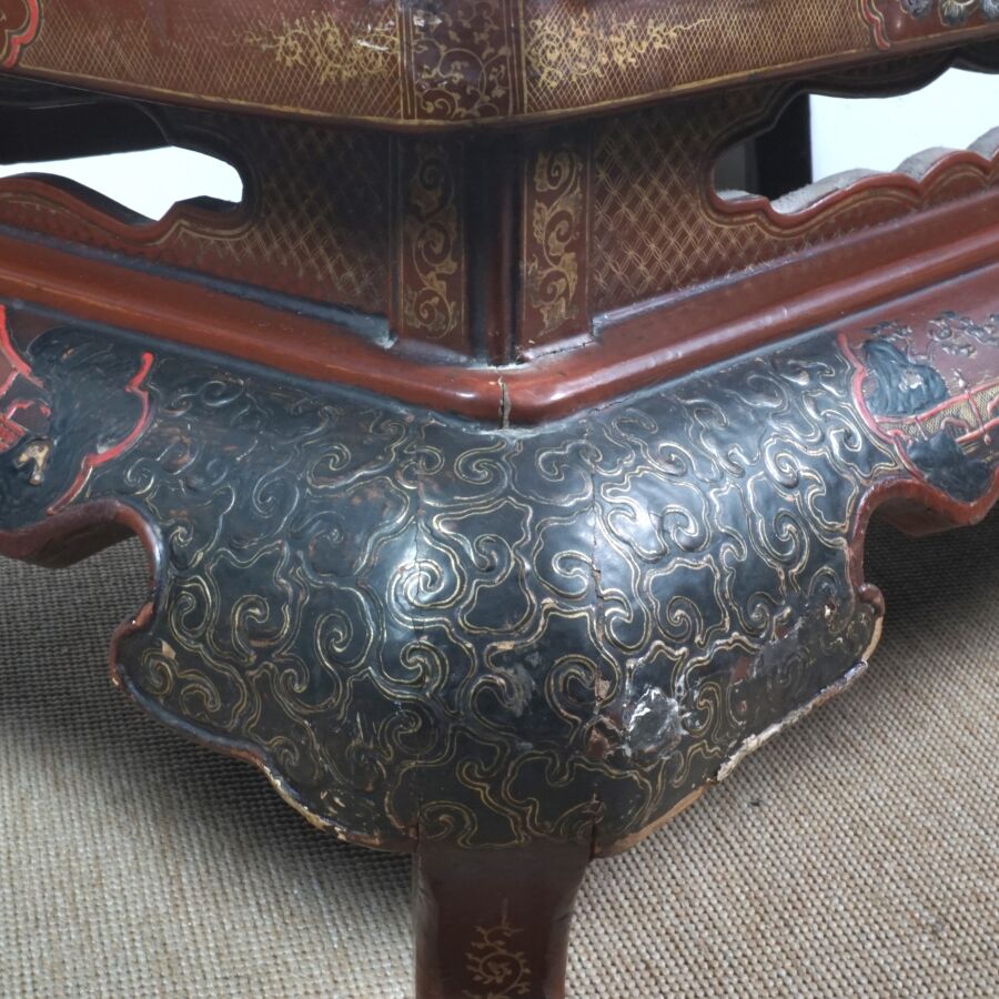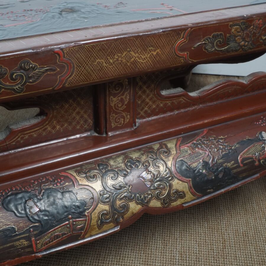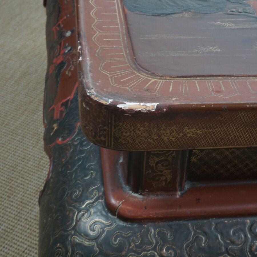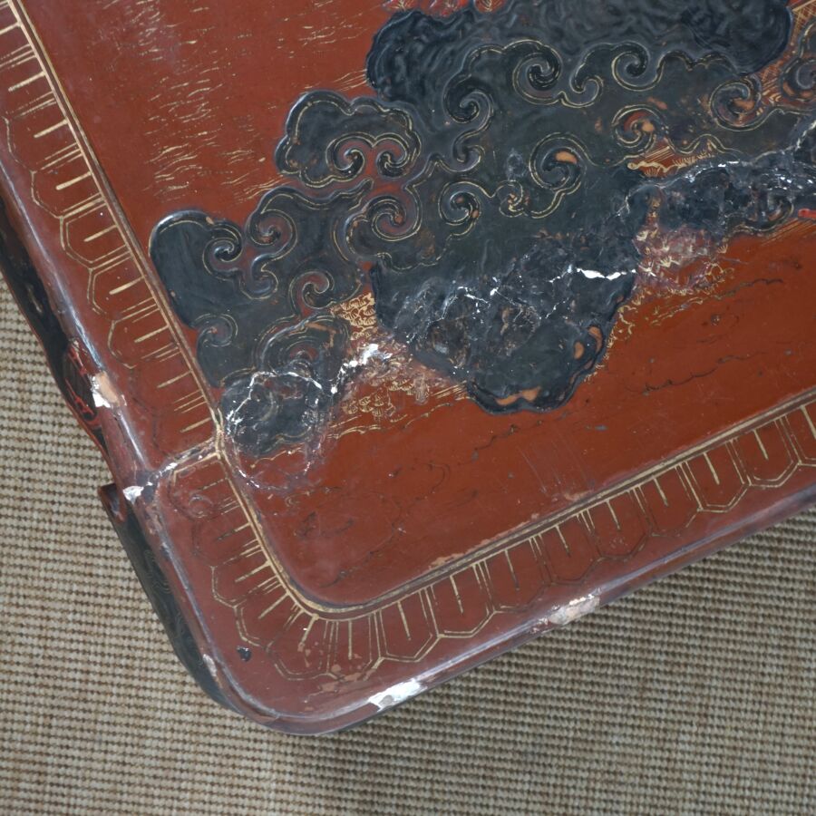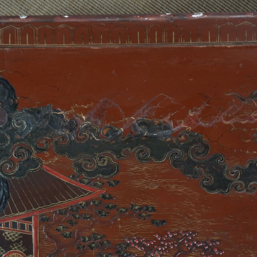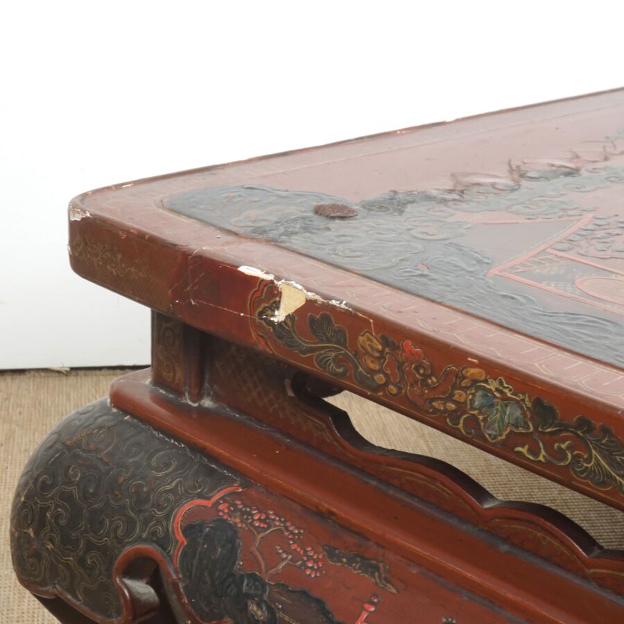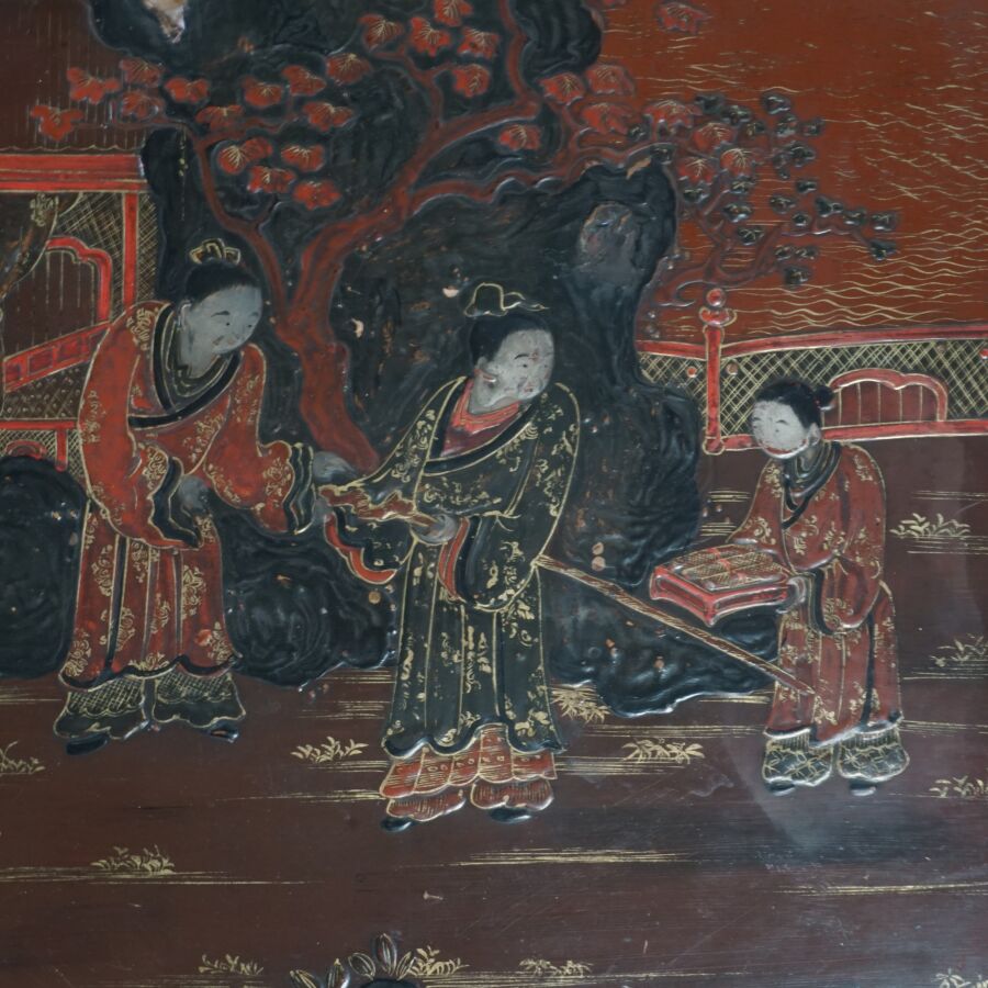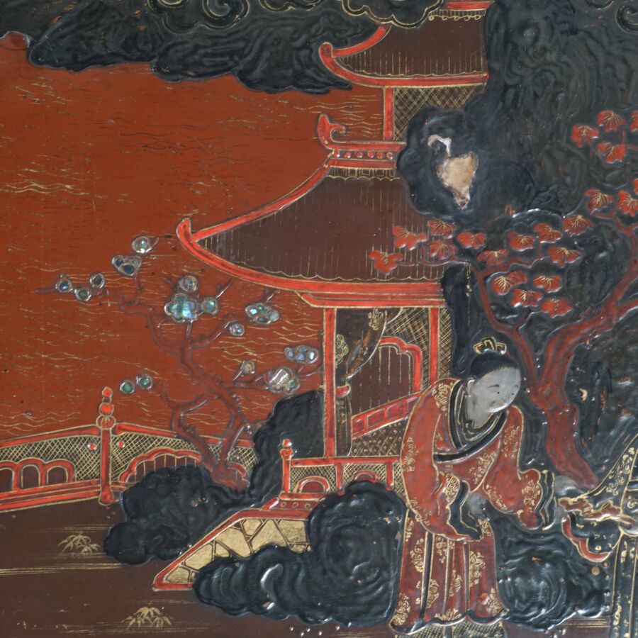 Table basse en bois laqué brun, rouge et rehauts d'or, à décor de jeunes femmes conversant sur une terrasse arborée aux abords de pagodons, Japon, circa 1900, Dim. 31.5 x 93 x 58.5 cm (accidents et manques, élément collé sur le laque sur le plateau).