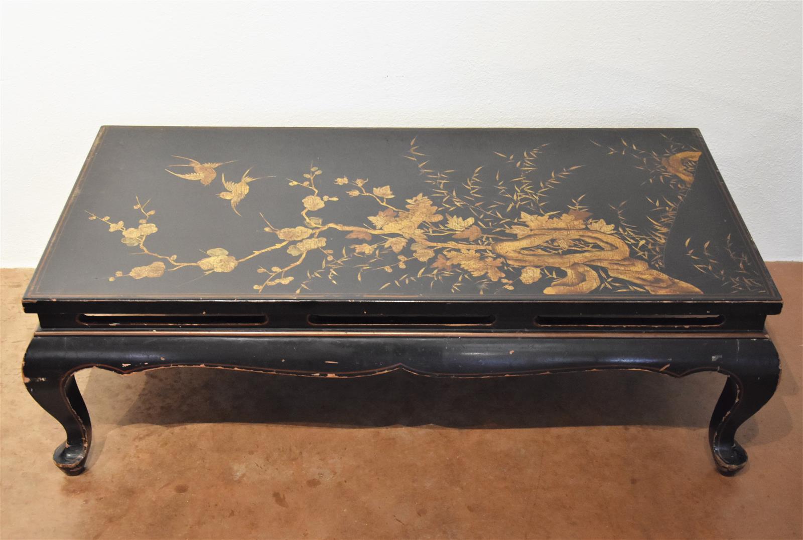 Table basse en panneaux de laque or sur fond noir, à décor de roches percées, oiseaux et prunus en fleurs, Chine, vers 1950, 110 x 55 x 36 cm.