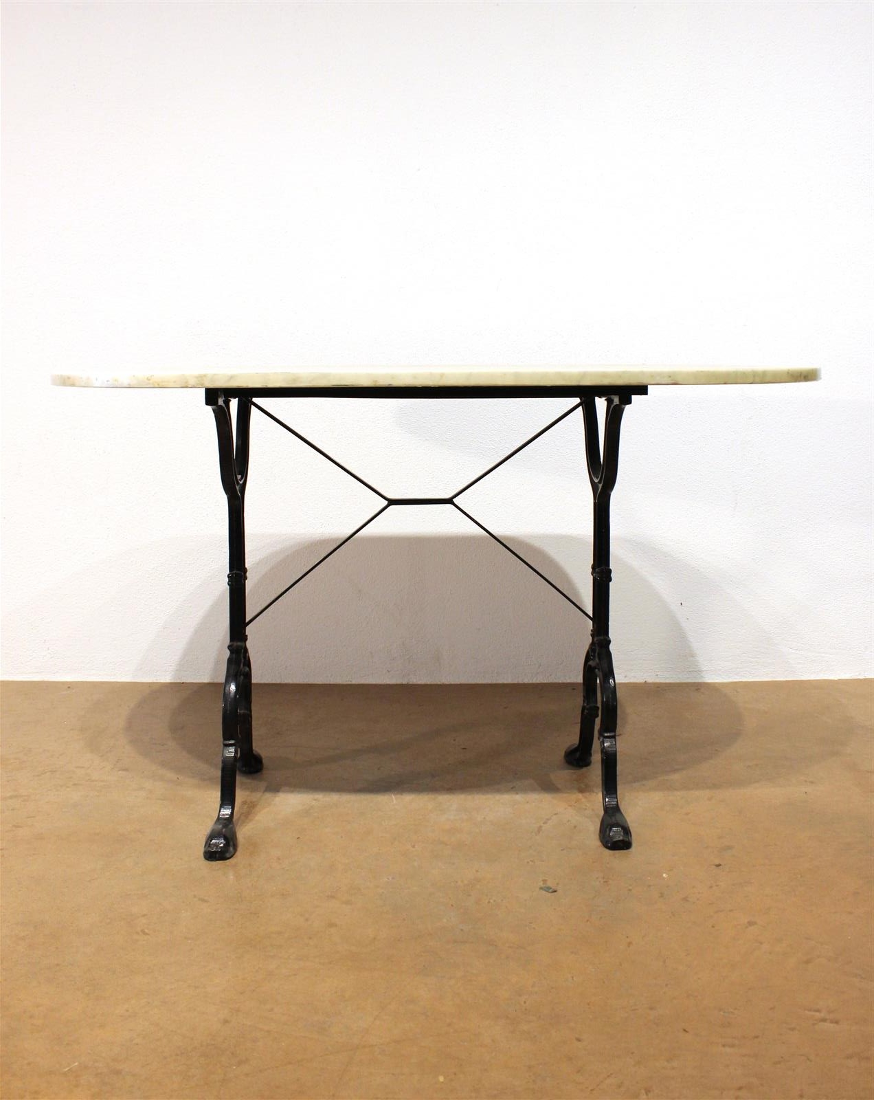 Table bistrot, plateau marbre blanc veiné, piétement en fonte, 70 x 120 x H. 72 cm (plateau mobile)