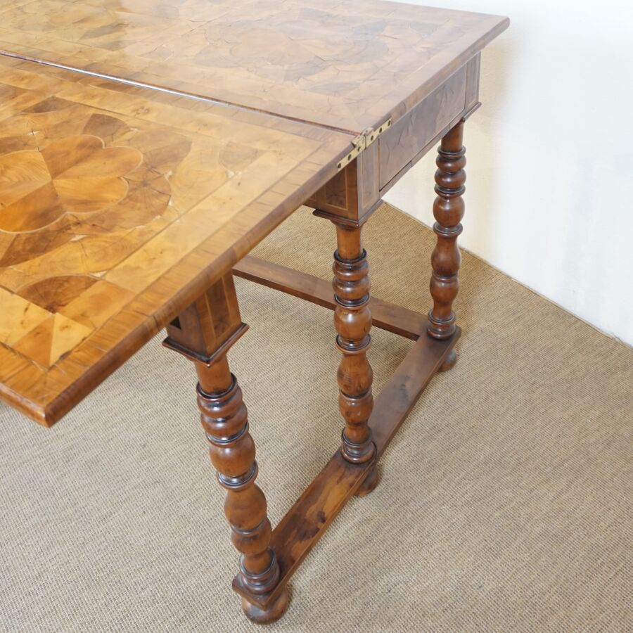 Table de changeur, bois et bois de placage, à plateau dépliant à décor de rosaces stylisées, reposant sur un piètement en bois tourné, travail du 18ème siècle, H. 75 cm, L. 92 cm, Larg. 46 cm (fermé) et 92 cm (ouvert) (quelques petites usures et sauts placage).