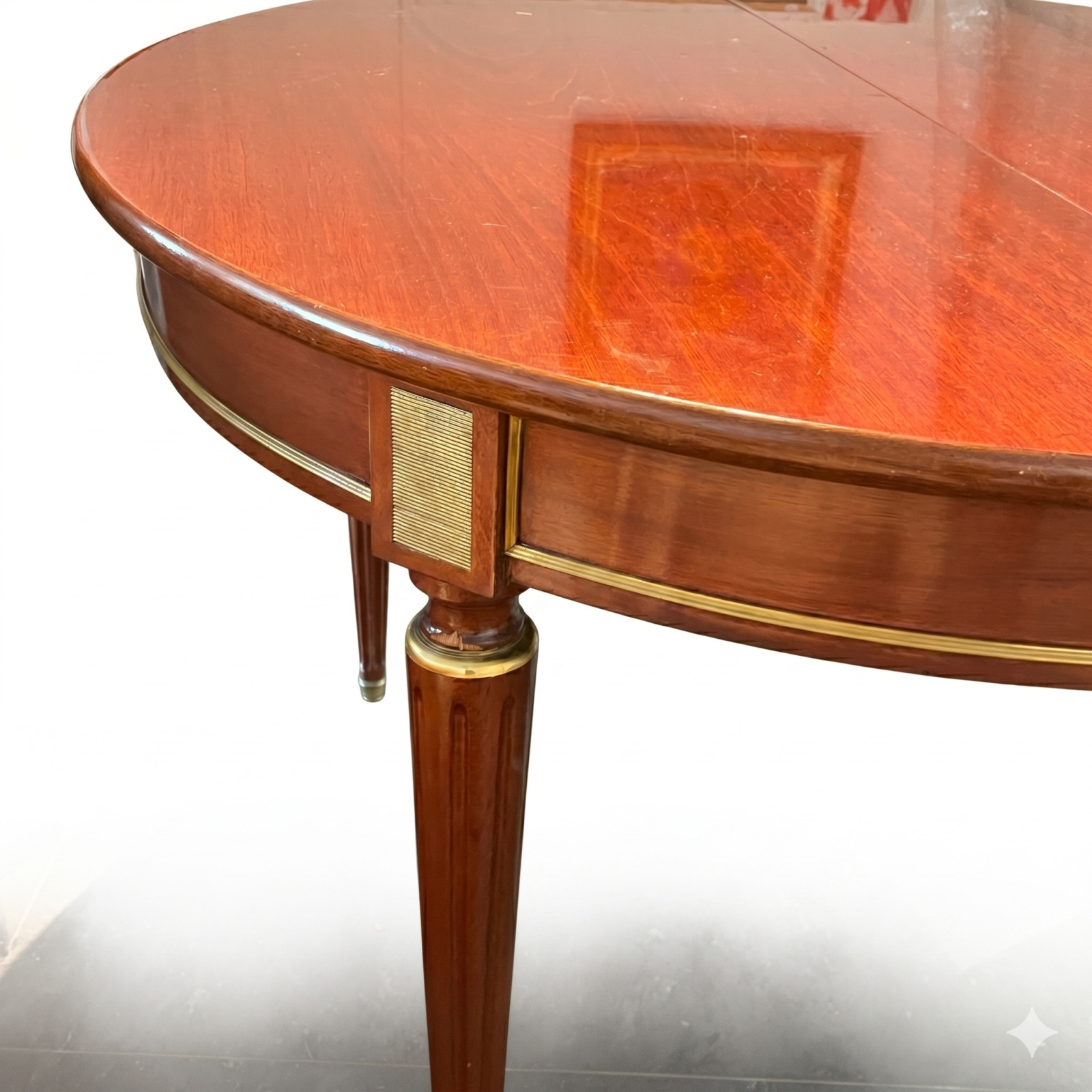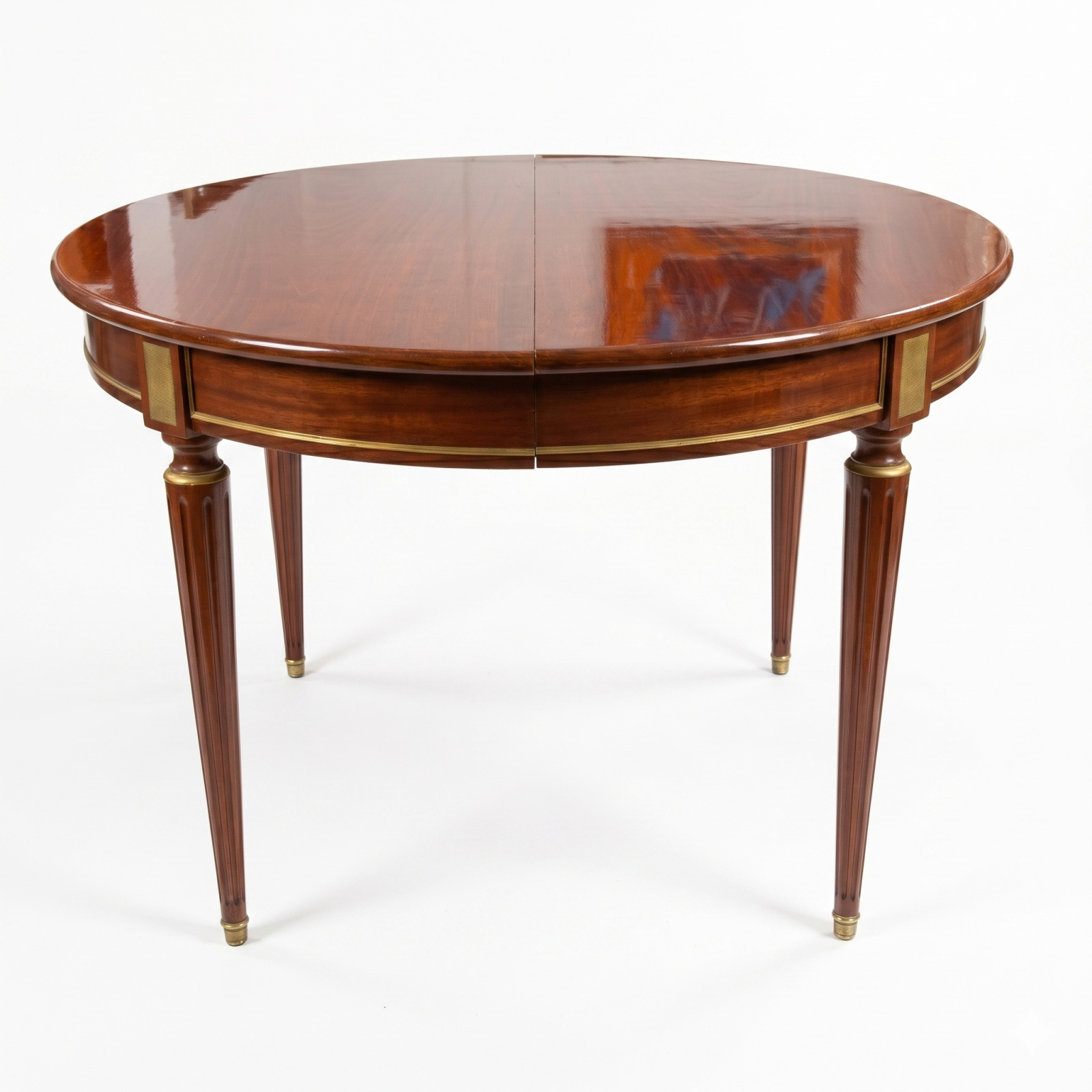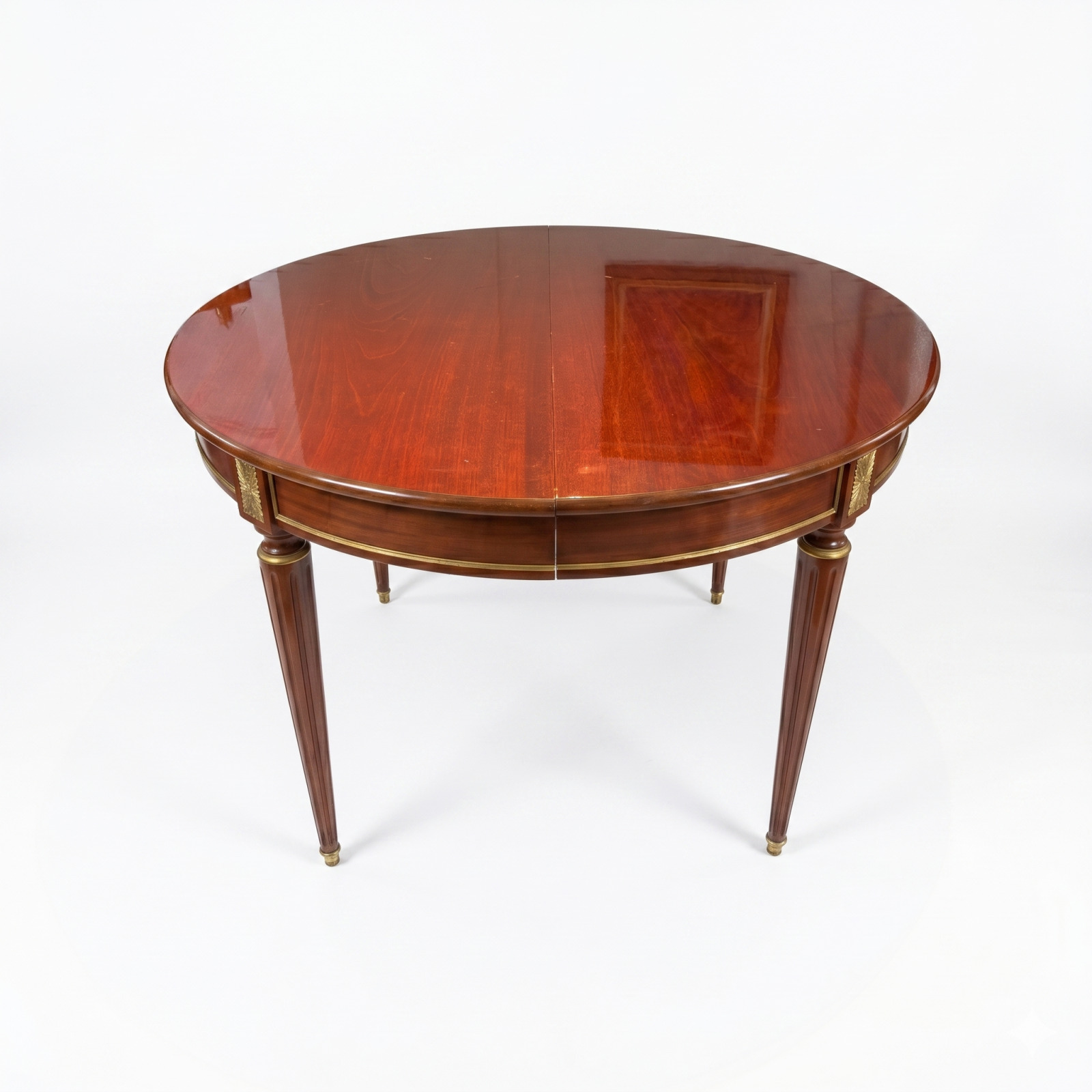Table de salle à manger ronde en placage d'acajou, reposant sur quatre pieds fuselés et cannelés, présentant un plateau de marbre blanc dans une galerie de laiton ajouré et dôtée de ses deux rallonges. Haut : 70 cm, Diam : 110 cm. (légères rayures, usures).