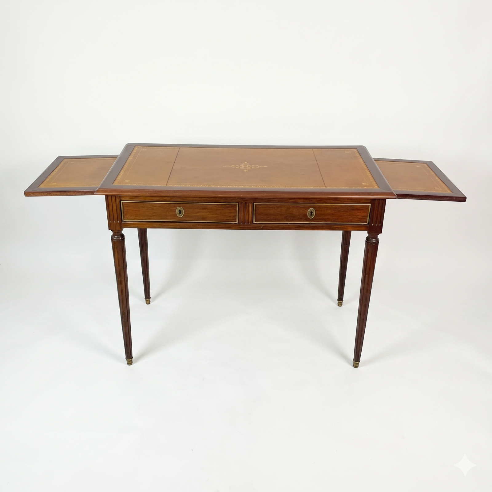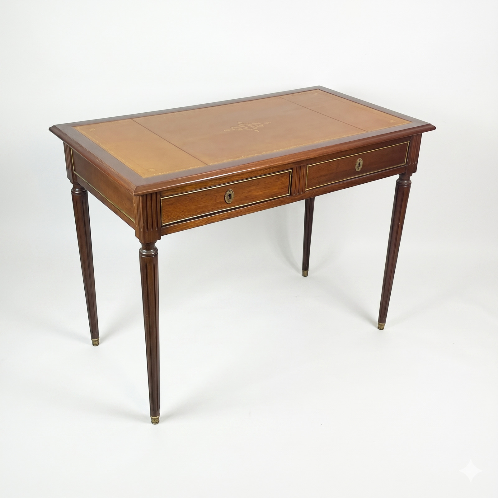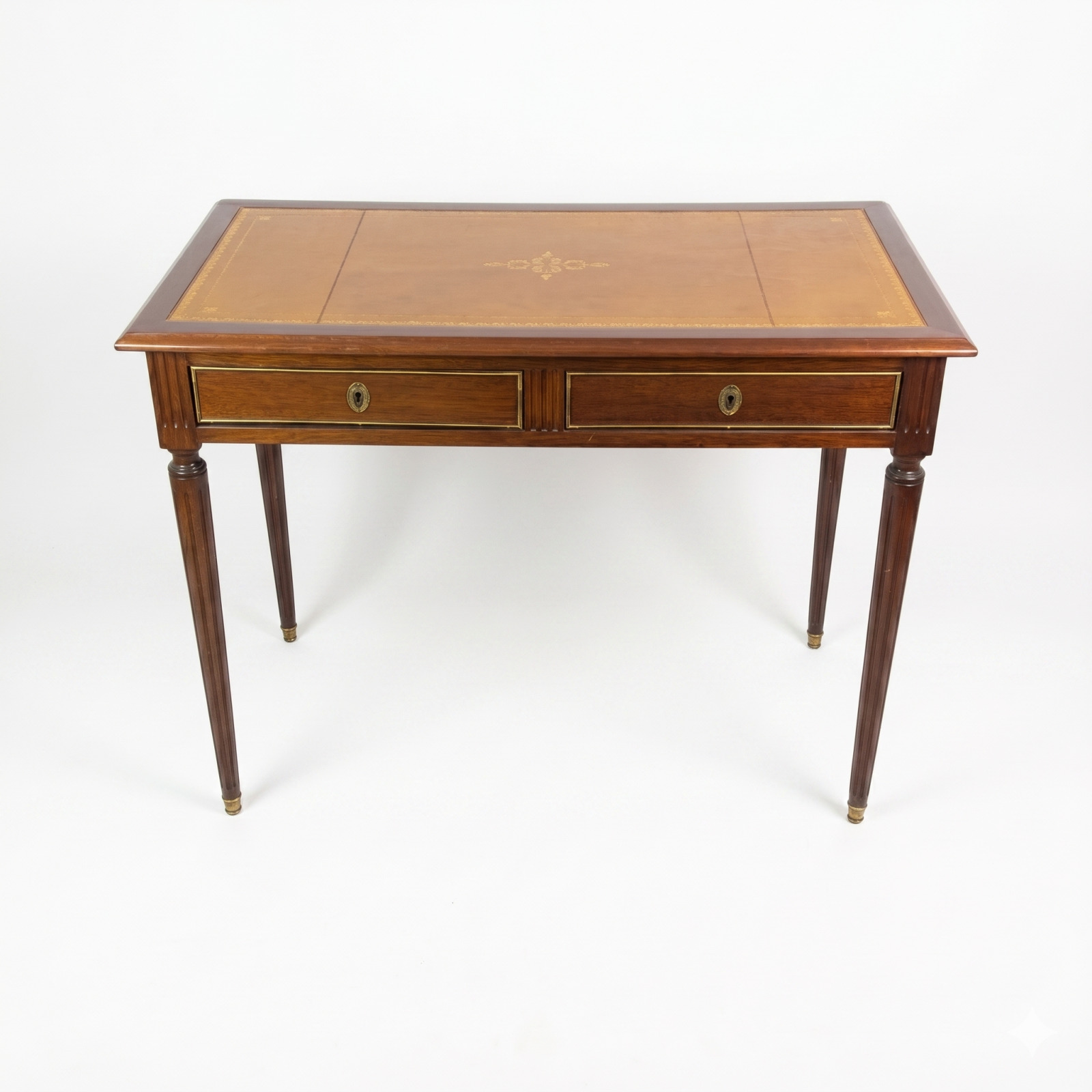 Table de style Louis XVI, en bois de placage, le plateau gainé de cuir, ouvrant par un tiroir en ceinture, reposant sur des pieds fuselés, 75.5 x 99.5 x 56 cm. (usures et traces sur le cuir)