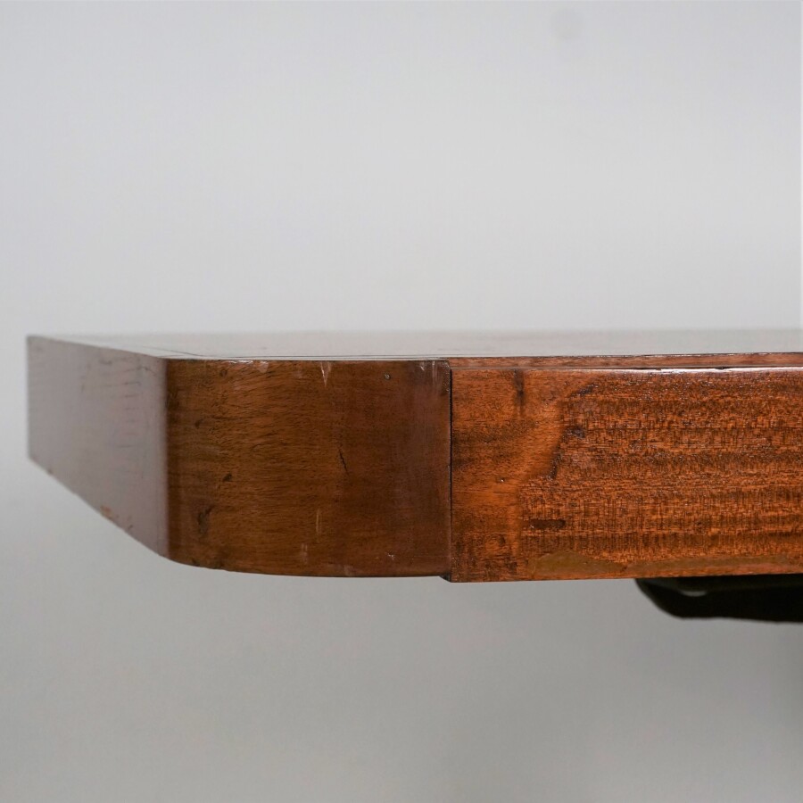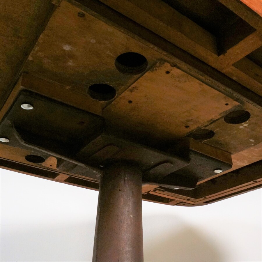 Table en acajou et placage d'acajou du paquebot "RMS Windsor Castle", 1959, plateau amovible rectangulaire à coins arrondis et pied en fonte sur un socle en placage d'acajou, 116 x 77 x H. 80 cm (légères usures).