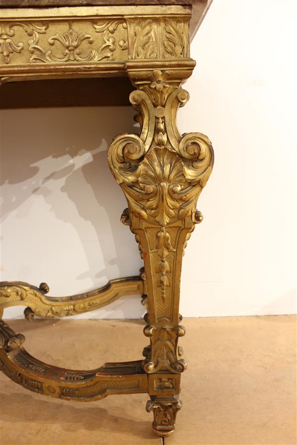Table en console style Louis XIV, en bois doré, la ceinture ornée de rinceaux feuillagés retient un tablier agrémenté d'un masque de femme, piétement gaine richement sculpté de feuillages, fleurettes et coquilles, relié par une entretoise en X à dé de raccordement, elle est coiffée d'un marbre rouge, fin 19e siècle, 157 x 63.5 x H. 90 cm (quelques éclats à la dorure, quelques manques aux feuillages des sabots, certains éléments fendus, quelques éclats anciens sur la bordure du marbre côté gauche)