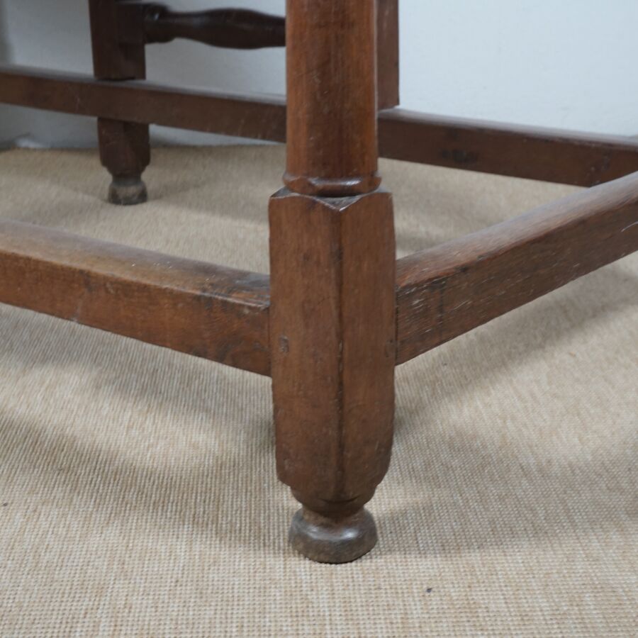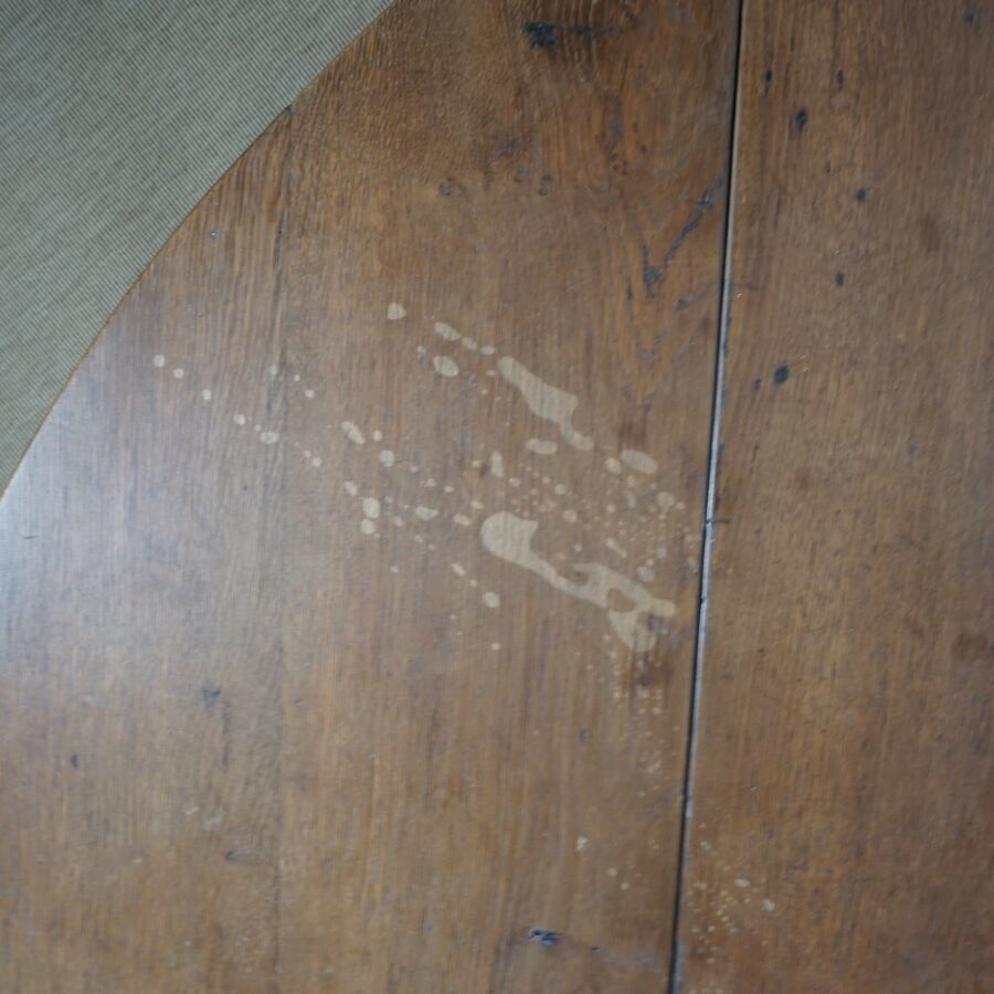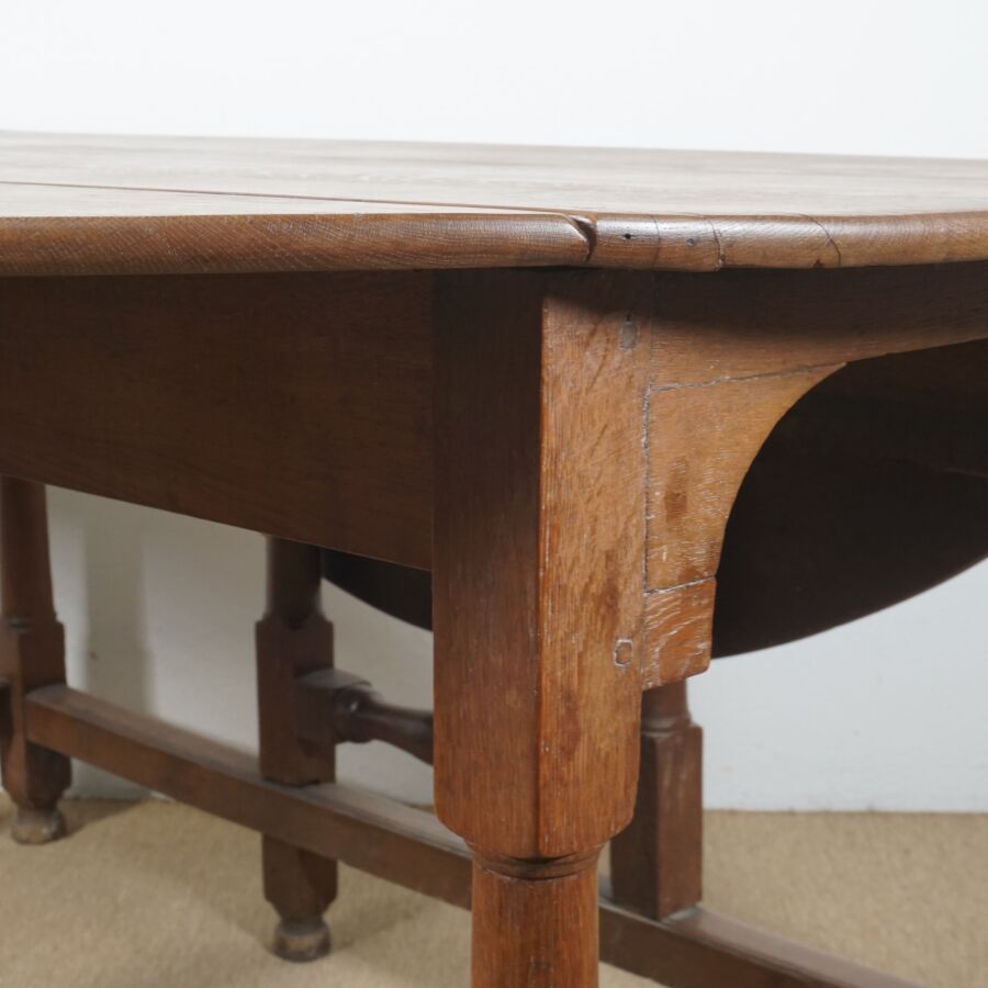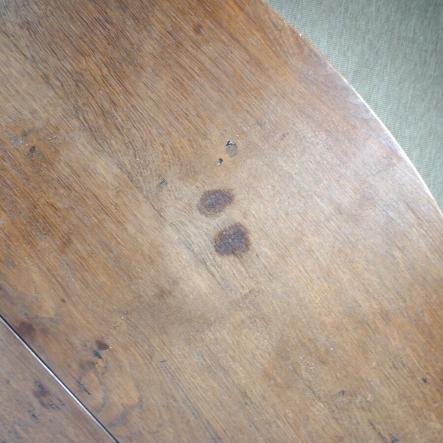 Table gateleg en bois, piétement en bois tourné réuni par une entretoise, H. 71.5 cm. D. 142 cm (usures, tâches et rayures).