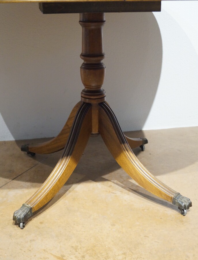 Table ovale en placage d'acajou et filet de bois clair, piètement central quadripode, les pieds terminés par de petites griffes de lion, 122 x 92 cm. H. 77 cm (avec une allonge).