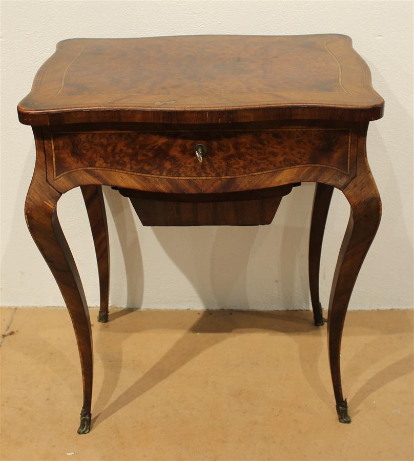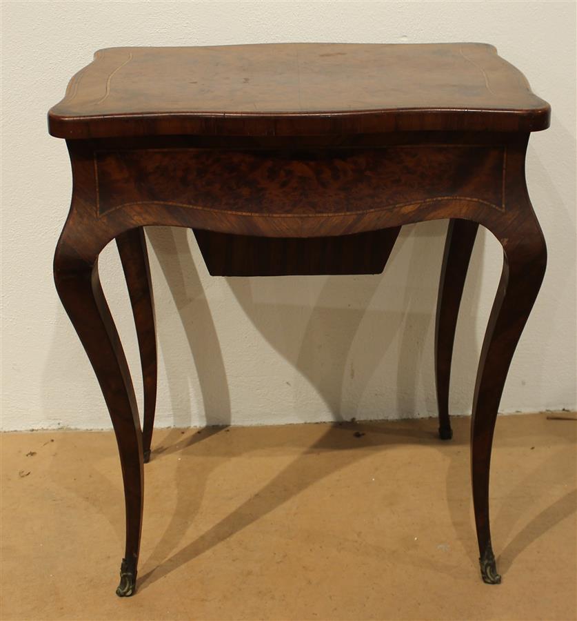 Table travailleuse style Louis XV, en placage de noyer et ronce de noyer, ouvrant à un tiroir en ceinture, piétement cambré terminé par des sabots en laiton, 19e siècle, 63 x 44.5 x H. 72.5 cm (accidents)
