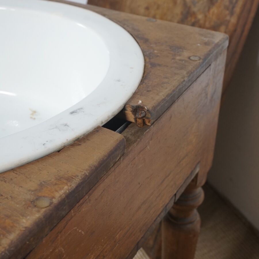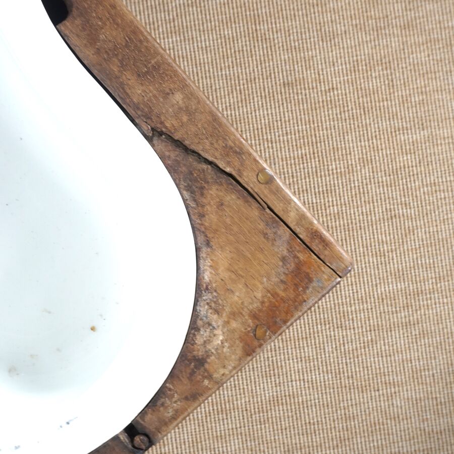 Tabouret d'aisance, structure en bois piètement tournée, cuve en céramique émaillée blanc, avec son couvercle en bois, 42 x 50 x 34 cm (manques et fentes).