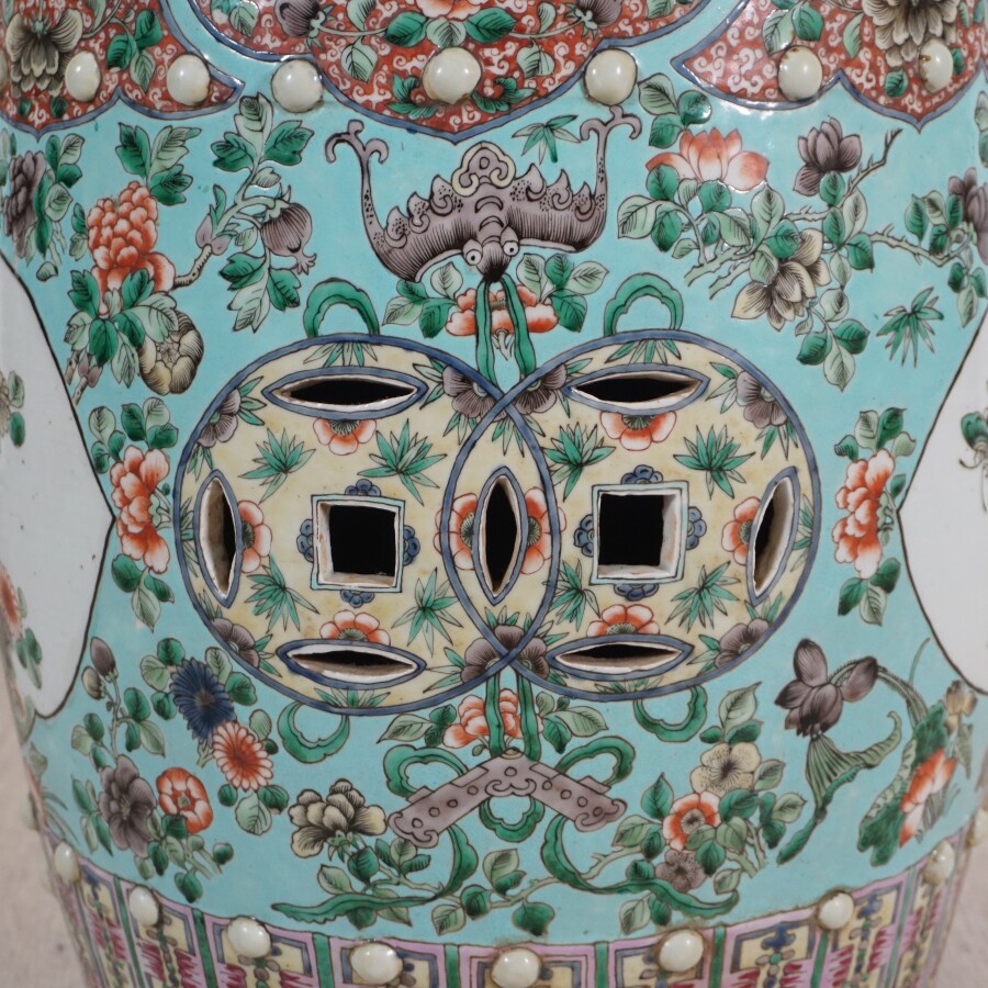 Tabouret en porcelaine et émaux de style famille verte à décor en médaillons d'oiseaux sur des arbustes en fleurs, lambrequins, têtes de ruyi, panneaux stylisés, Chine, période Ganxu, H. 47 cm.