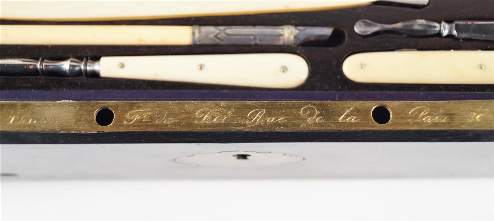 TAHAN - Fournisseur du Roi : Coffret de toilette en poirier noirci et incrustations de laiton, complet de ses nombreux flacons avec leurs bouchons en argent poinçon Minerve, et accessoires dont peignes, brosse et nécessaire de manucure, répartis sur 3 niveaux, le couvercle à fond de glace, 13, 5 x 22 x 30 cm (quelques petits accidents au placage du coffret, avec une clé).