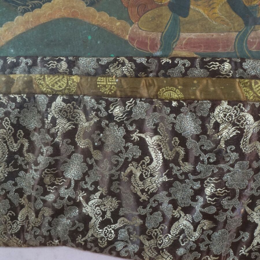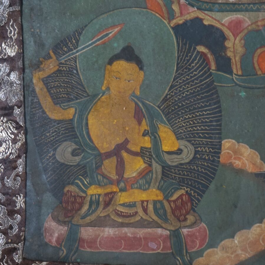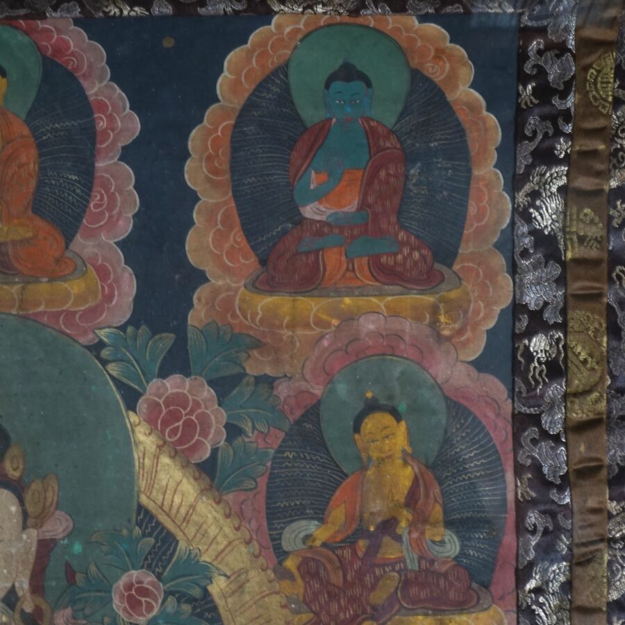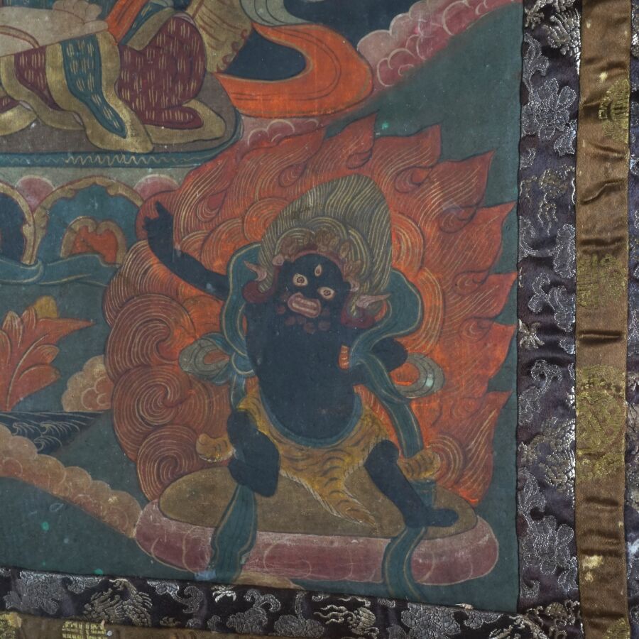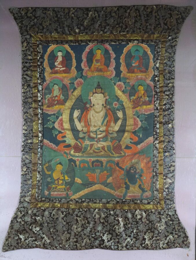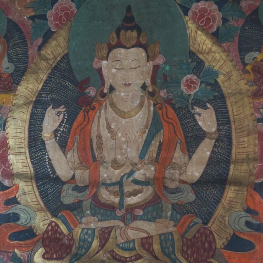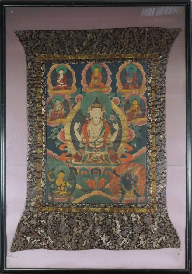 Tangkha représentant Avalokitésvara " Chenrezig " à quatre bas, les mains principales en anjali mudra, les mains secondaires tenant pour l'une le lotus, le rosaire mala dans l'autre main, entouré des cinq bouddhas de méditation. Dans la partie inférieure Manjushri tenant le glaive et une divinité courroucée, Népal, fin du 19ème siècle, Dim. 108 x 80 cm (à vue) (usures).