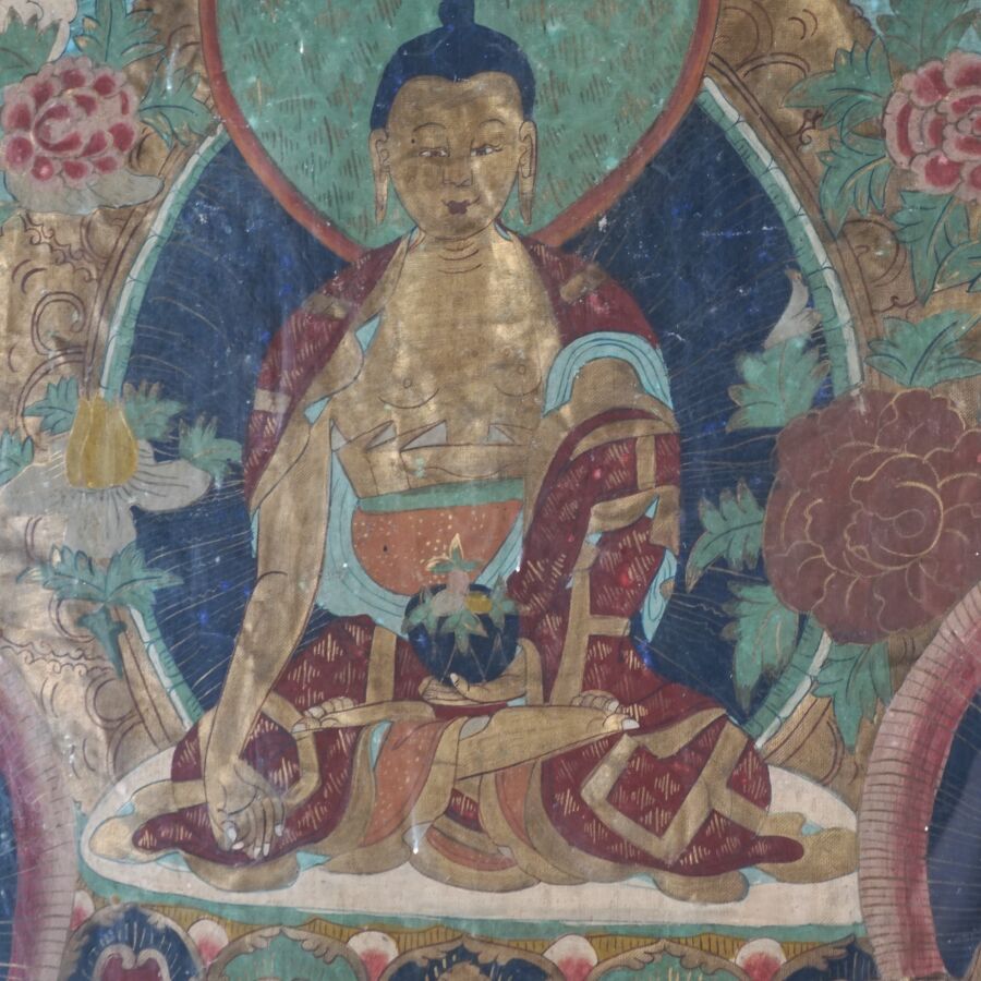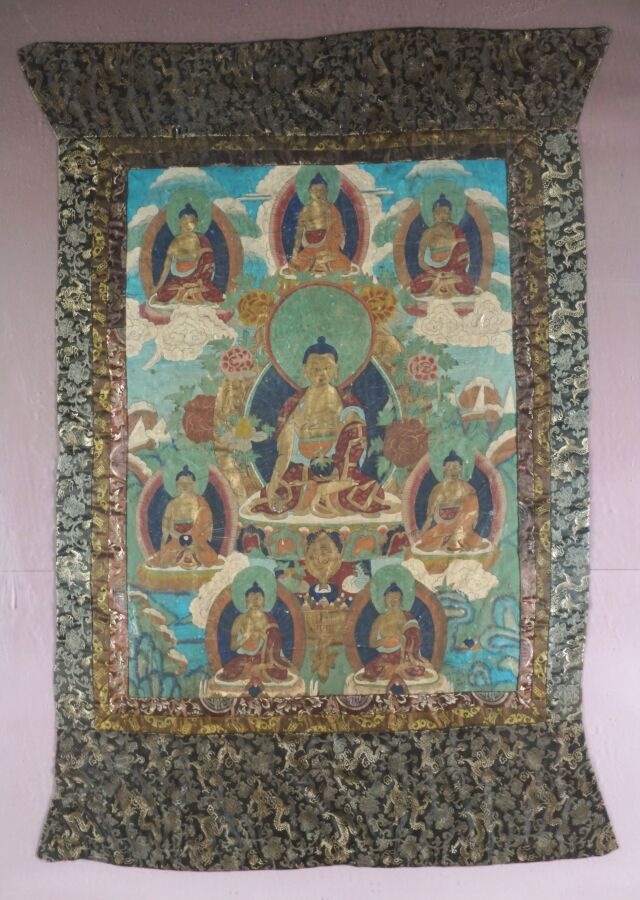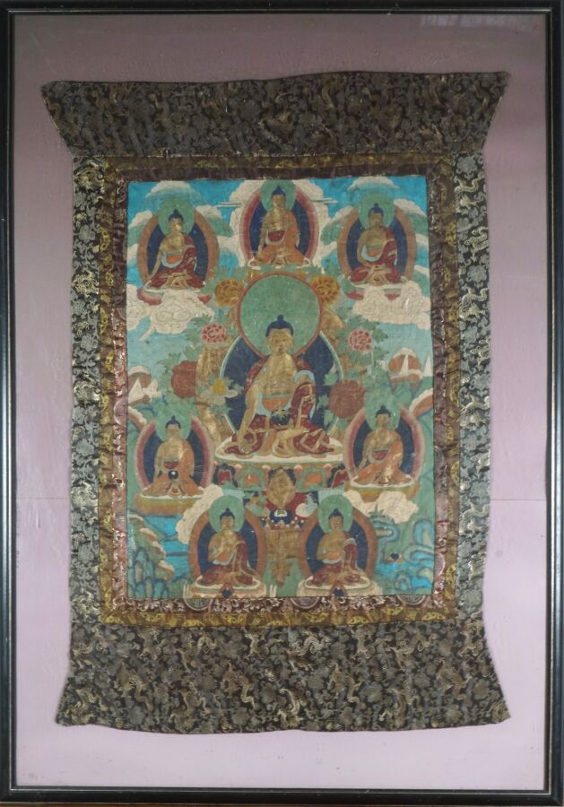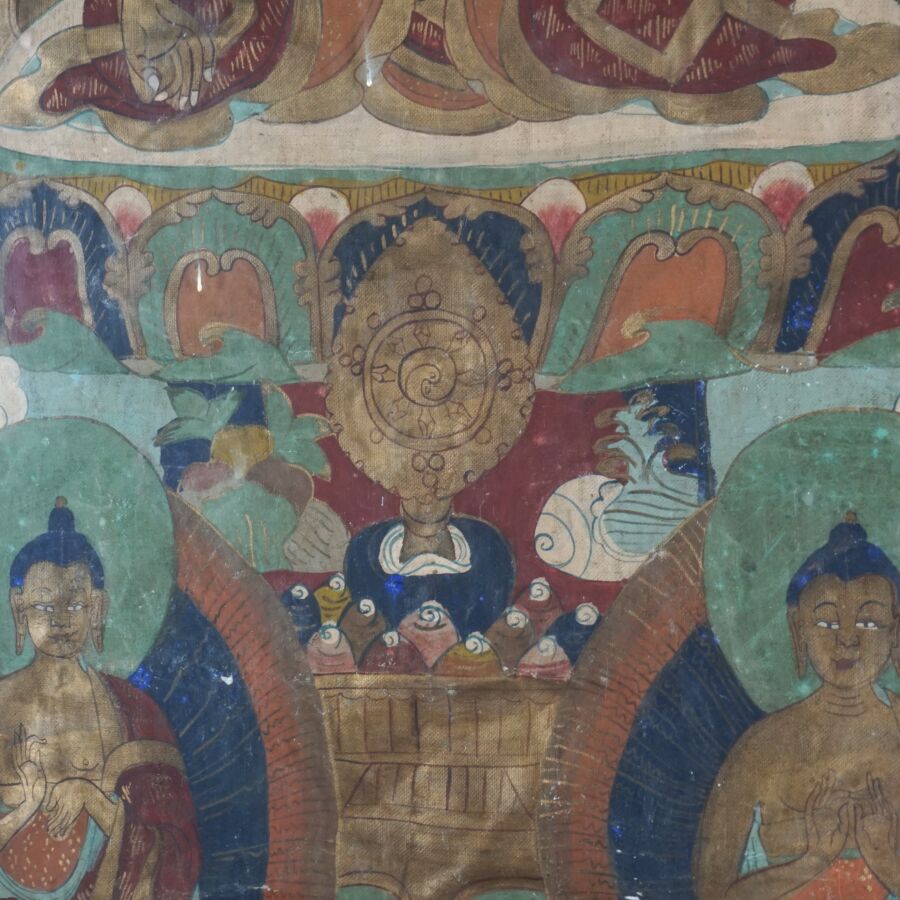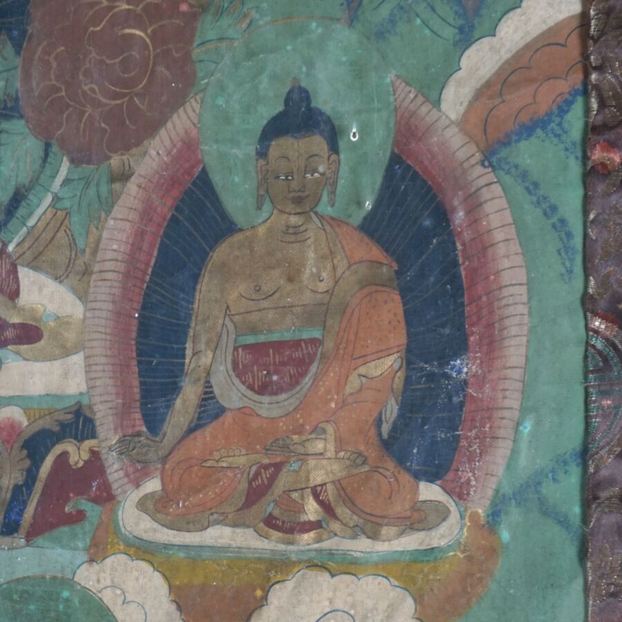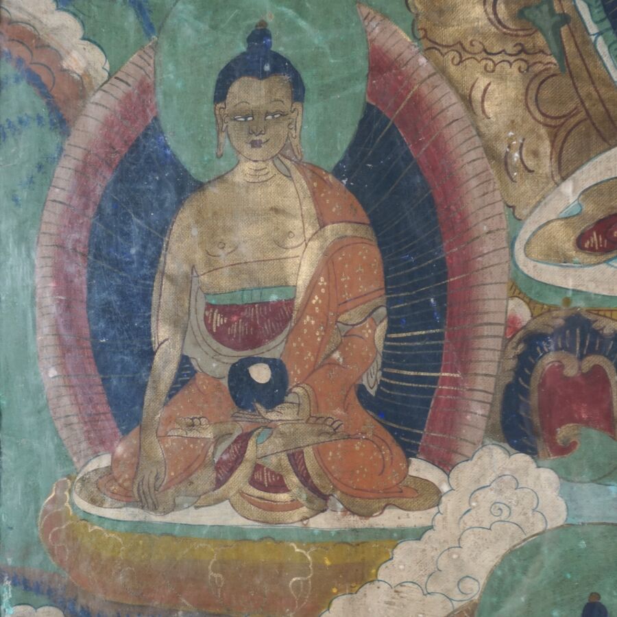 Tangkha représentant Sakyamuni, tenant un bol à offrandes, entouré de bouddhas dans différents mudra, Népal, première moitié du 20ème siècle, Dim. 108 x 80 cm (à vue) (usures).