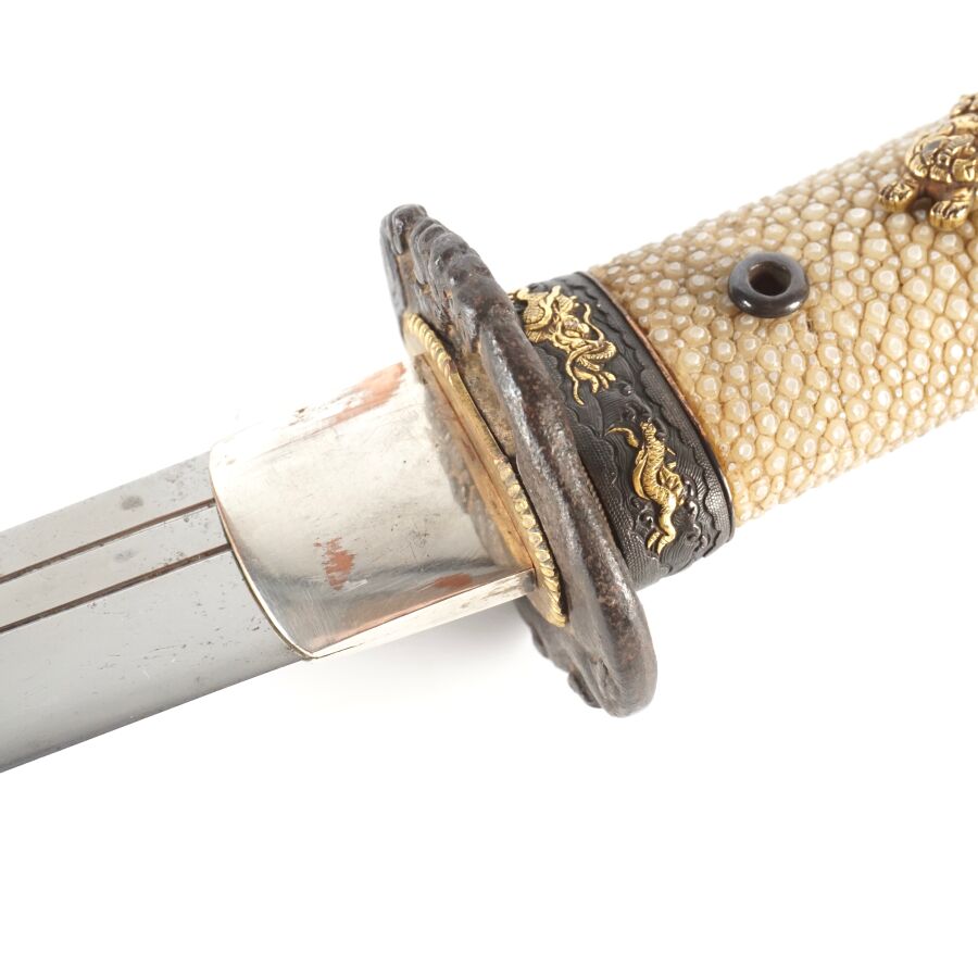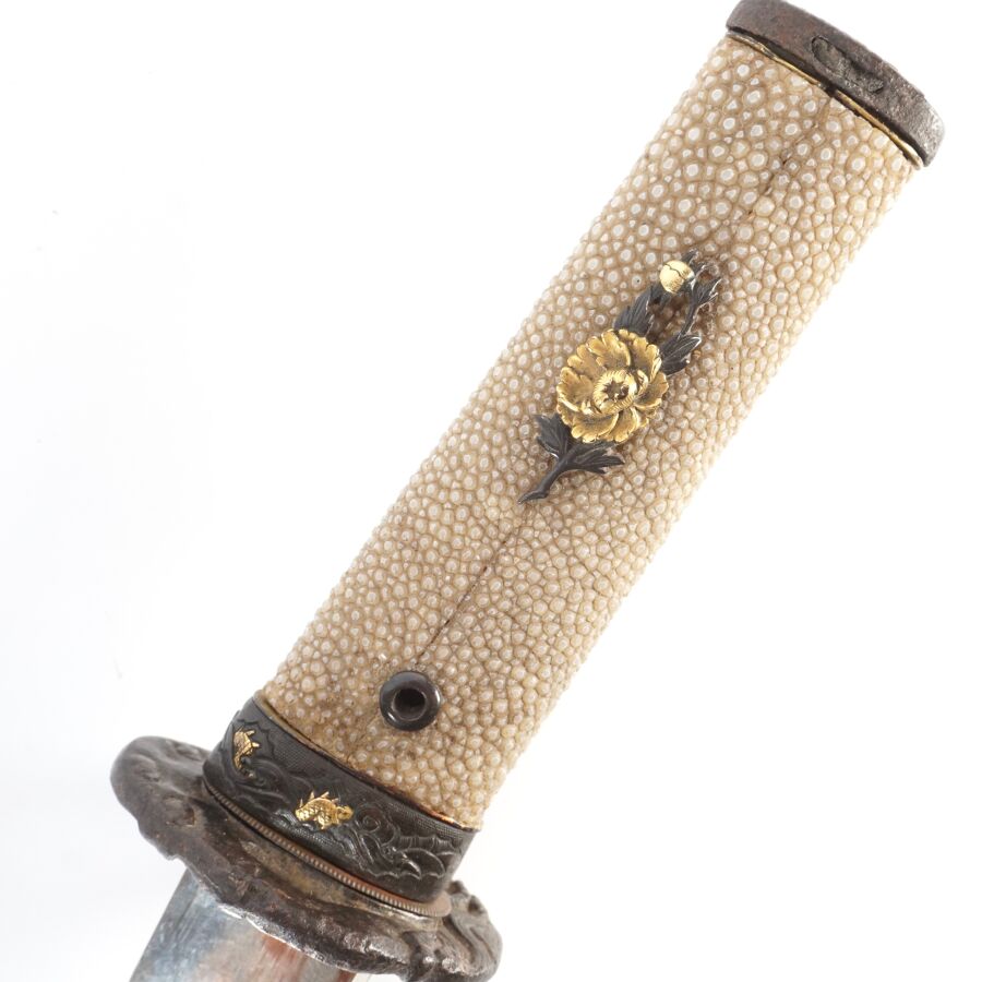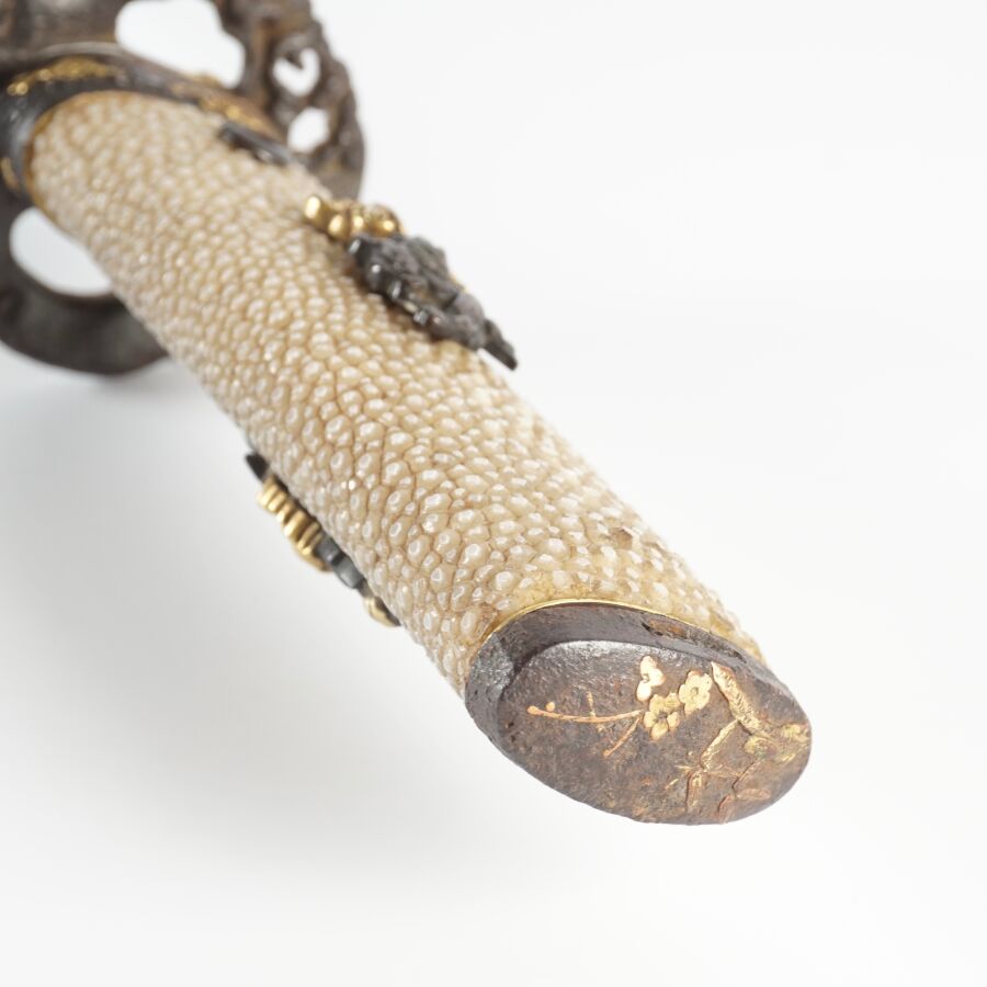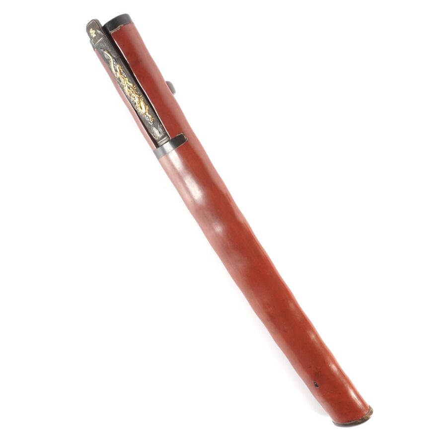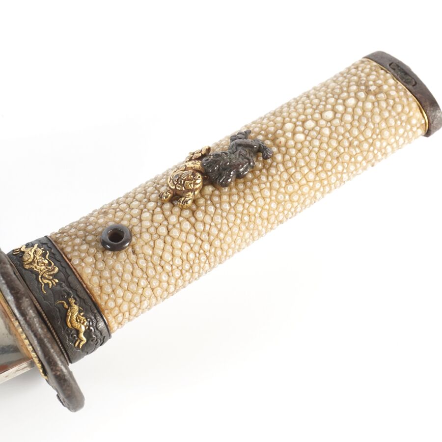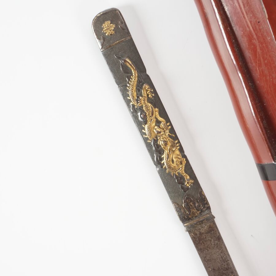Tanto, lame en acier à décor gravé sur une face, tsuba en fer patiné à décor de vagues écumantes, le tsuka garni de galuchat beige-brun et orné de deux menuki à motif de lions bouddhiques et d'une fleur de chrysanthèmes, fuchi à décor de dragons sur fond de nanako, le Tsuska-Gahira en fer à motif de bambous, avec son fourreau (saya) en bois laqué brun-rouge avec son Kozuka en shakudo à décor d'un dragon et d'une feuille d'érable, Japon, période Meiji, L. Totale 'avec saya) : 48.5 cm (petites usures).