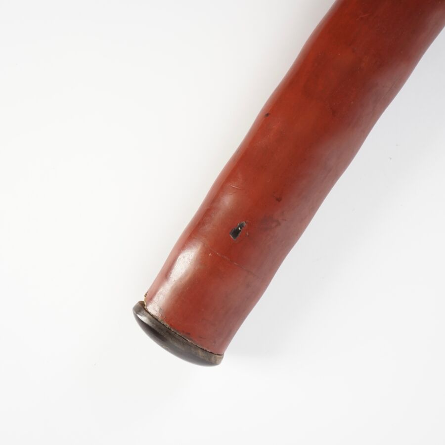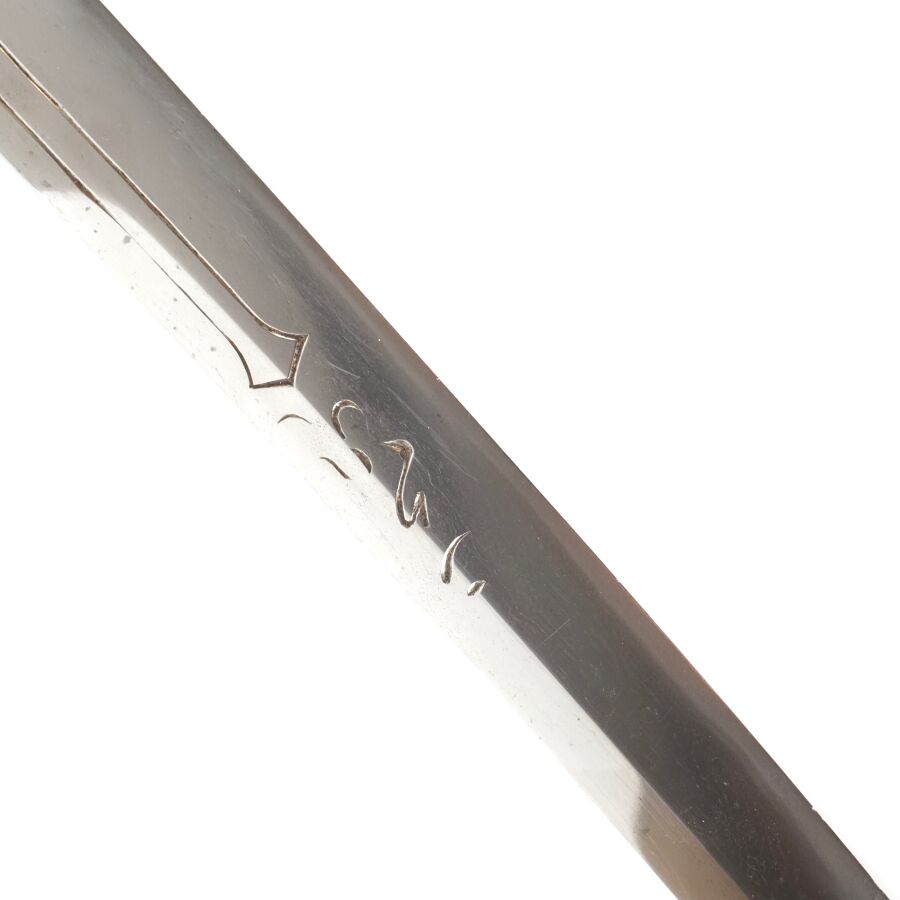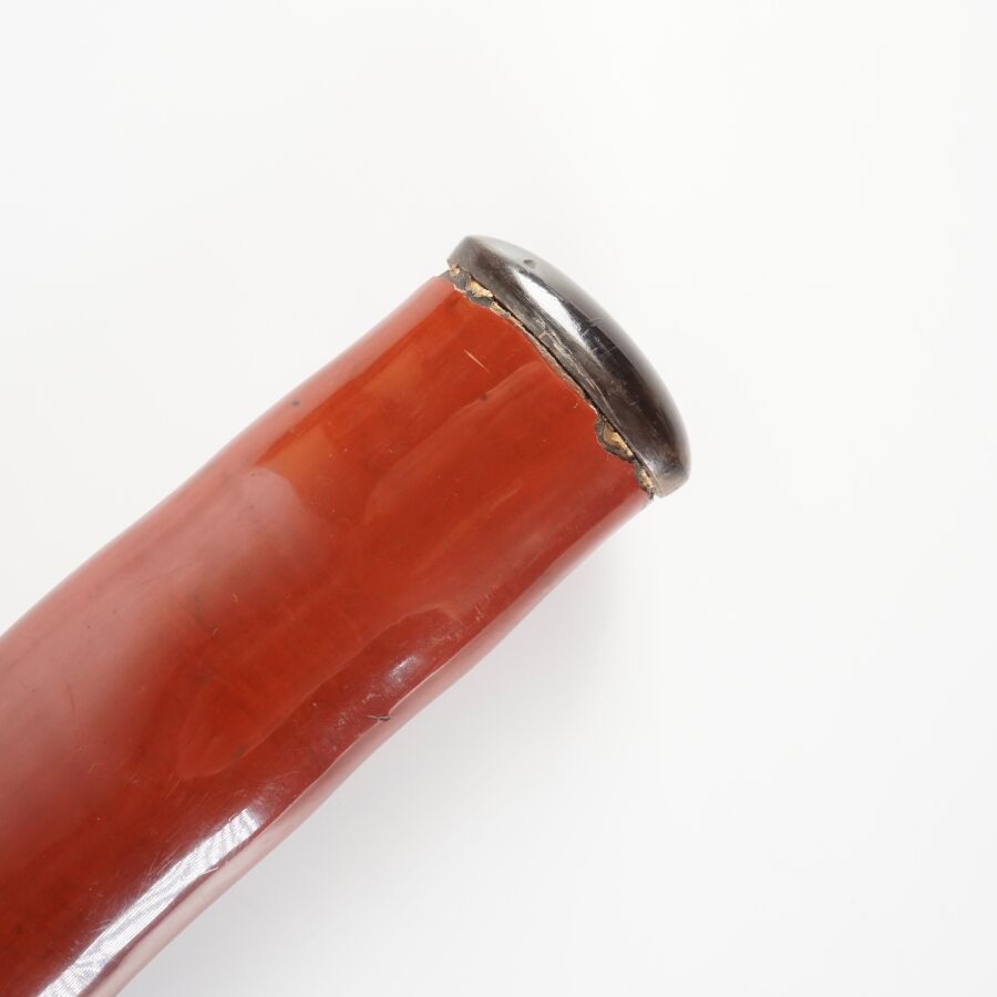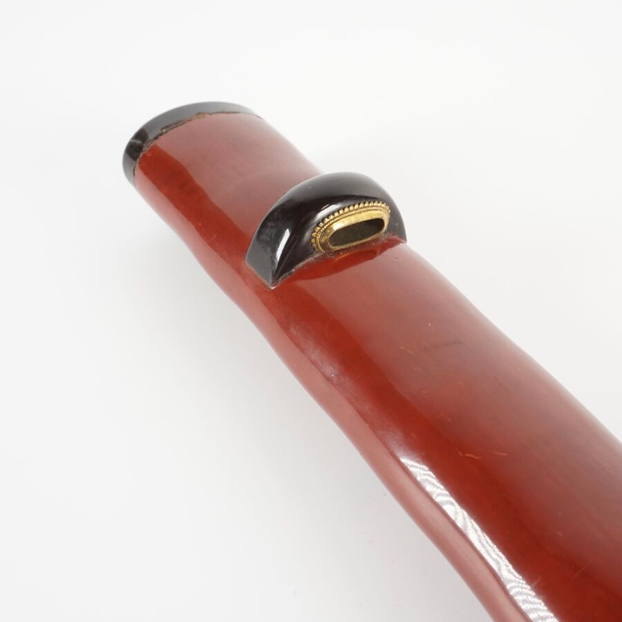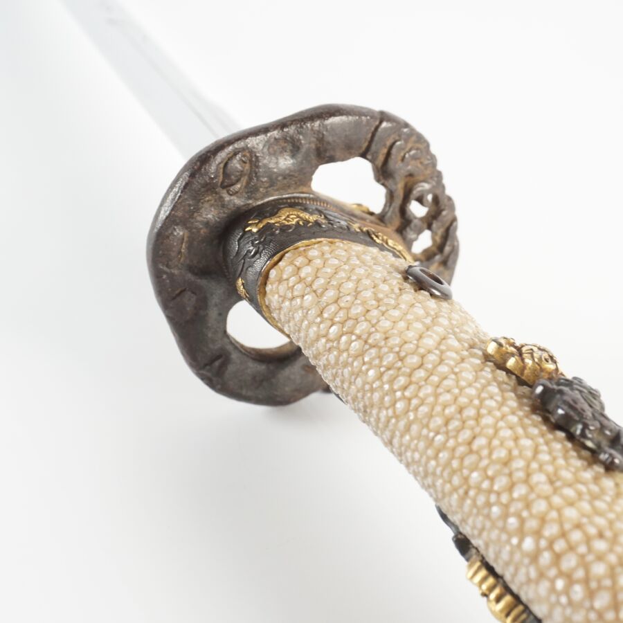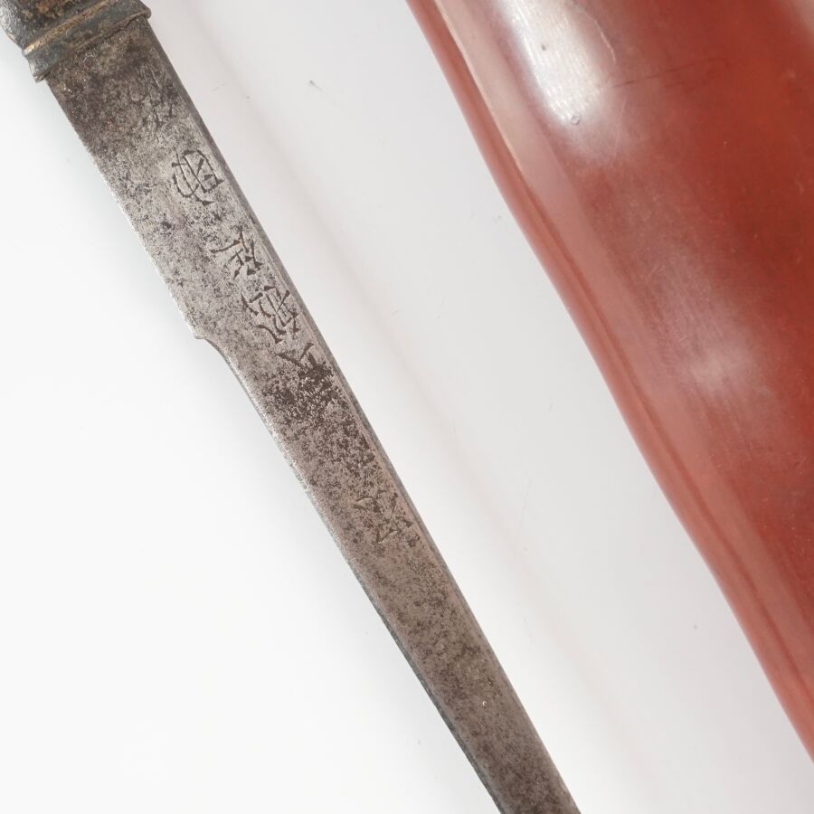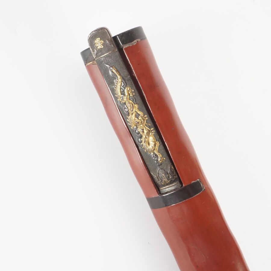 Tanto, lame en acier à décor gravé sur une face, tsuba en fer patiné à décor de vagues écumantes, le tsuka garni de galuchat beige-brun et orné de deux menuki à motif de lions bouddhiques et d'une fleur de chrysanthèmes, fuchi à décor de dragons sur fond de nanako, le Tsuska-Gahira en fer à motif de bambous, avec son fourreau (saya) en bois laqué brun-rouge avec son Kozuka en shakudo à décor d'un dragon et d'une feuille d'érable, Japon, période Meiji, L. Totale 'avec saya) : 48.5 cm (petites usures).