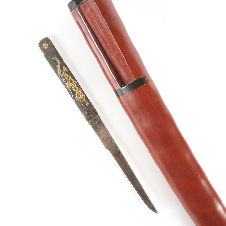 Tanto, lame en acier à décor gravé sur une face, tsuba en fer patiné à décor de vagues écumantes, le tsuka garni de galuchat beige-brun et orné de deux menuki à motif de lions bouddhiques et d'une fleur de chrysenthèmes, fuchi à décor de dragons sur fond de nanako, le Tsuska-Gahira en fer à motif de bambous, avec son fourreau (saya) en bois laqué brun-rouge avec son Kozuka en shakudo à décor d'un dragon et d'une feuille d'érable, Japon, période Meiji, L. Totale 'avec saya) : 48.5 cm (petites usures).