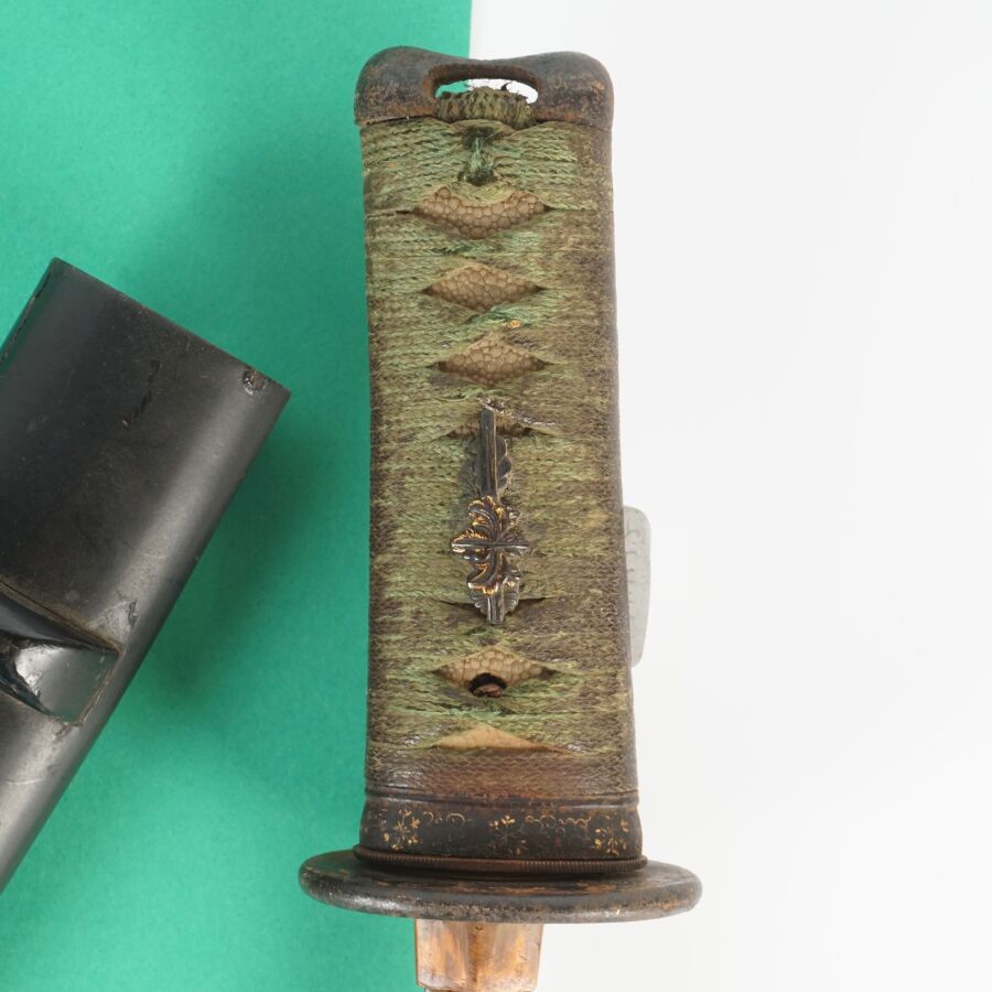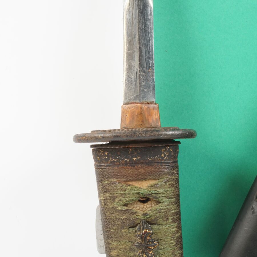 Tanto perce-armure, avec son fourreau en laque noire orné en applique d'un poisson en relief en sentoku, tsuba à décor niellé de rinceaux, menuki en forme de feuille d'érables, Japon, période Meiji (1868-1912), Dim. lame. 22,7 cm (manque le kozuka, usures).