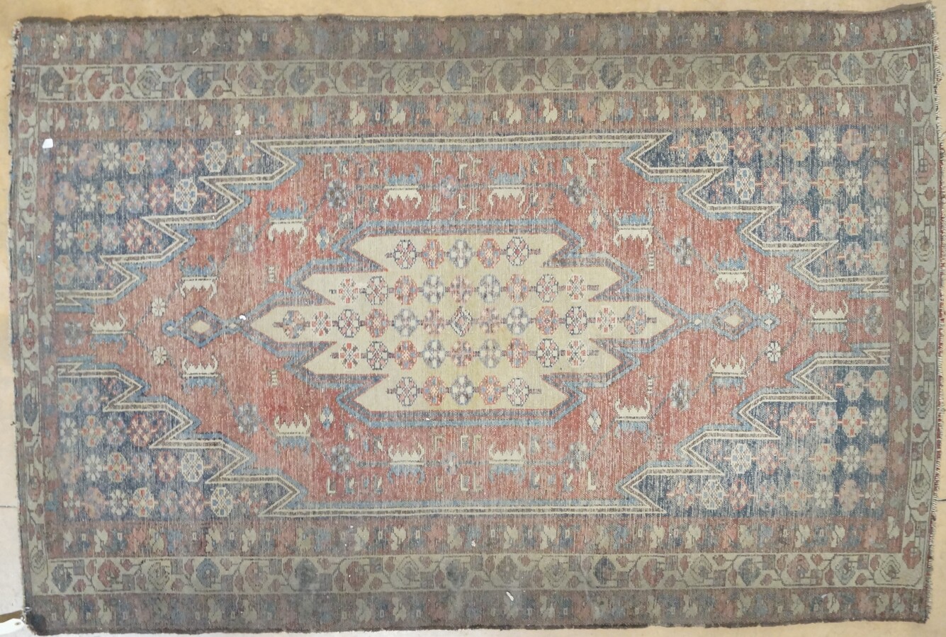 Tapis d'Iran en laine fait main à décor géométrique sur fond rouge-bordeaux, début du 20e siècle, 194 x 127 cm (en l'état).