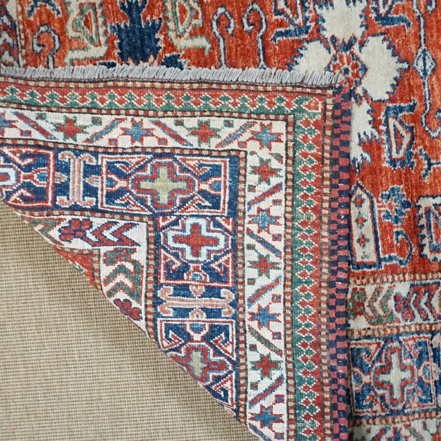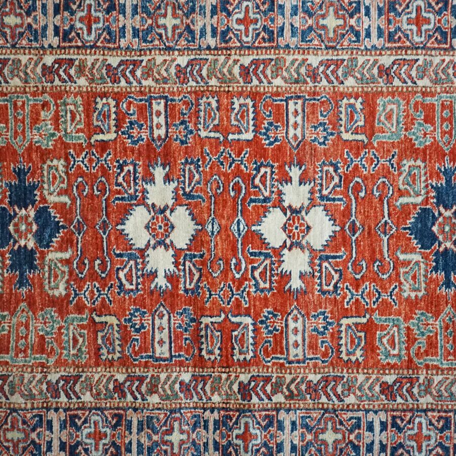 Tapis en laine à décor géométrique polychrome, travail fait main, Asie, première moitié du 20ème siècle, 160 ×124 cm (petites usures).