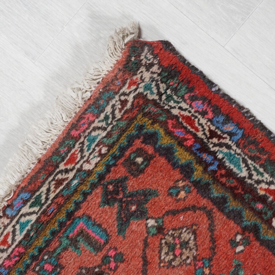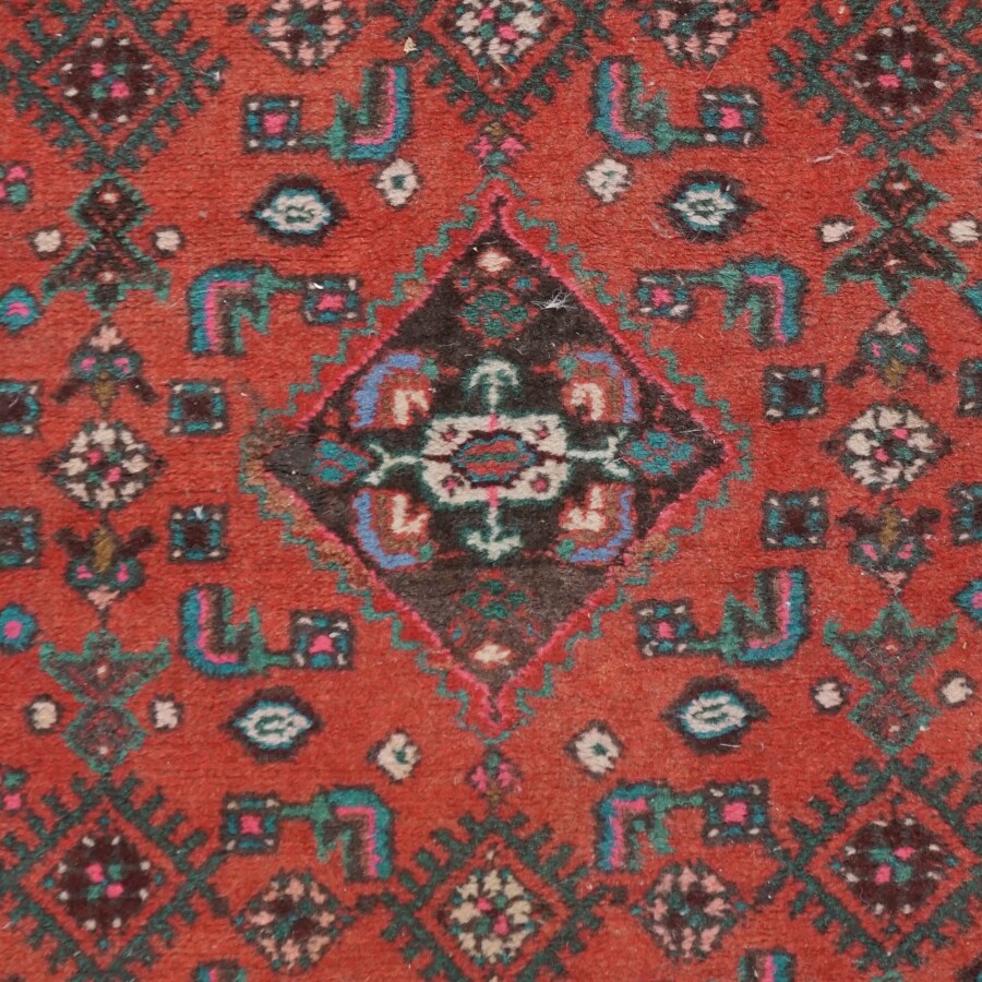 Tapis en laine, fait main, à décor géométrique et ethnique sur fond rouge, présente une étiquette à son dos, Iran (?), 115 x 76 cm (usures aux franges).