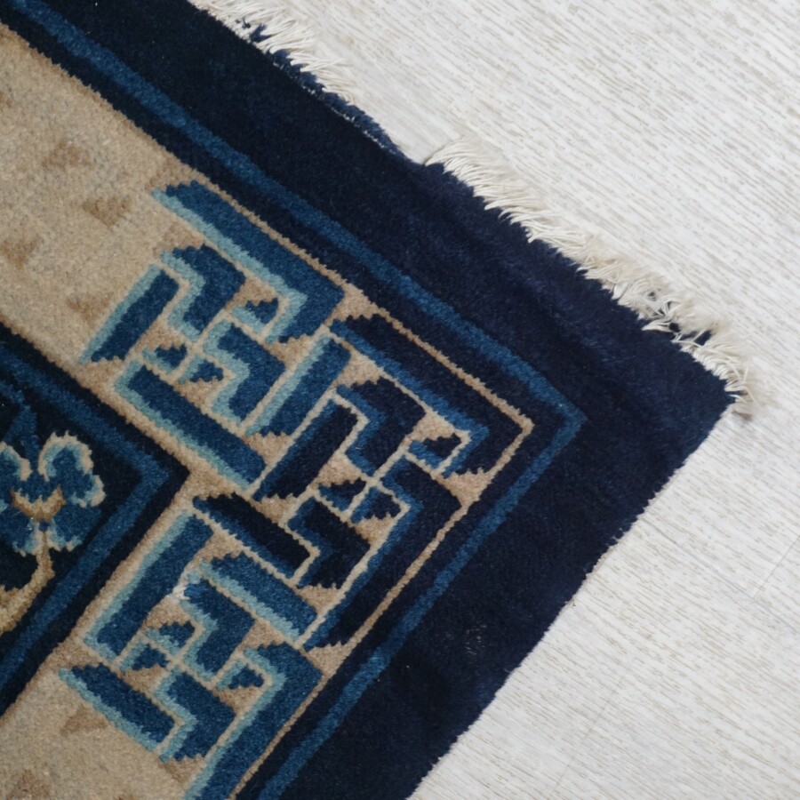 Tapis en laine, fond bleu, décor d'un médaillon central et chiens de Fô, Chine, 20ème siècle, 203 x 130 cm.
