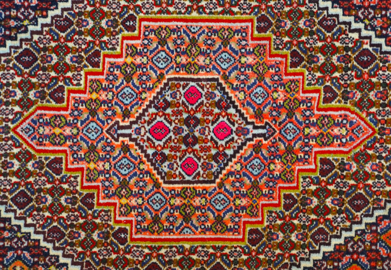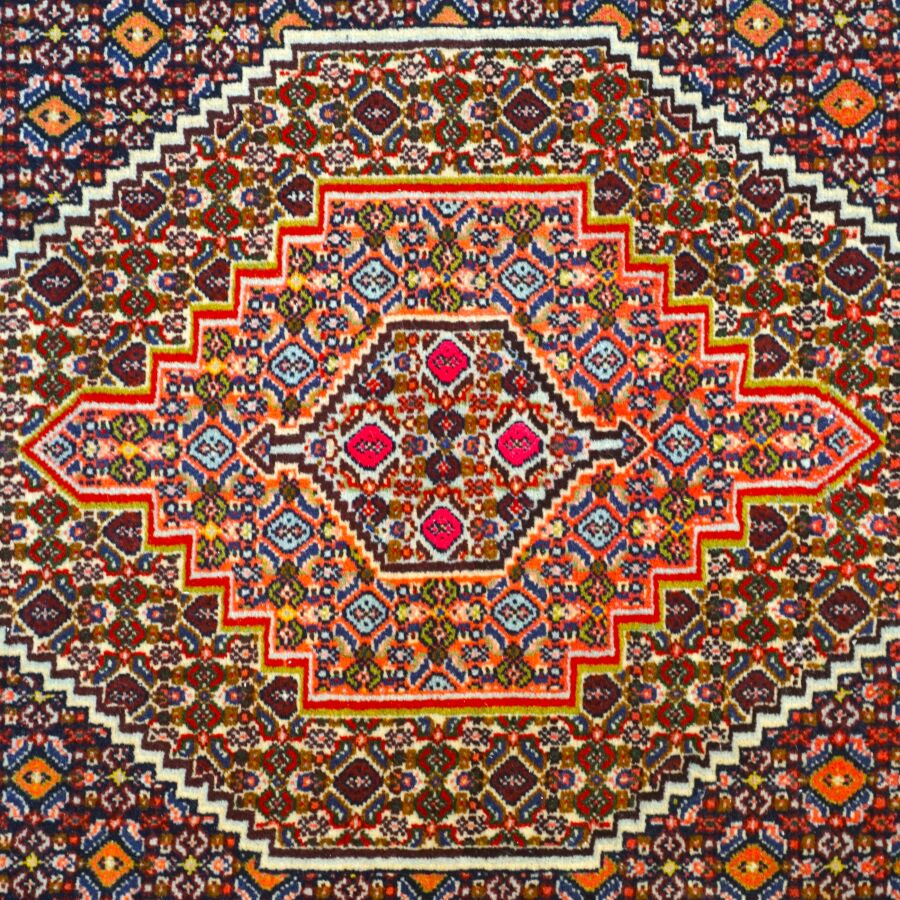 Tapis en laine polychrome à décor géométrique sur fond brun, tissage mécanique, 107 x 75 cm (usures d'usage).