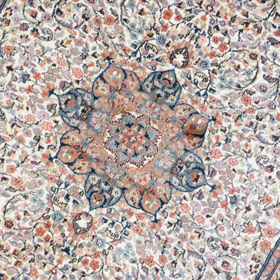 Tapis, laine et soie polychrome, à décor de fleurs stylisées et rosaces dans les tons violets et rose, 376 x 270 cm (quelques usures).