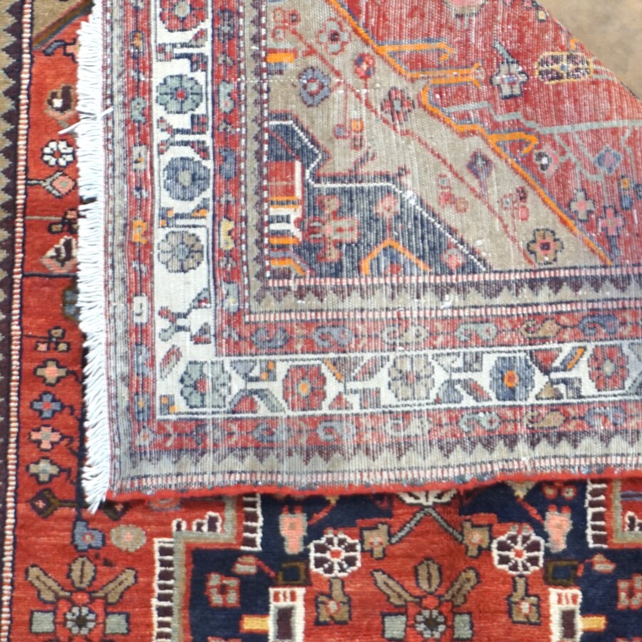 Tapis, laine polychrome à décor architecturé sur fond rouge, 280 x 155 cm (usures).