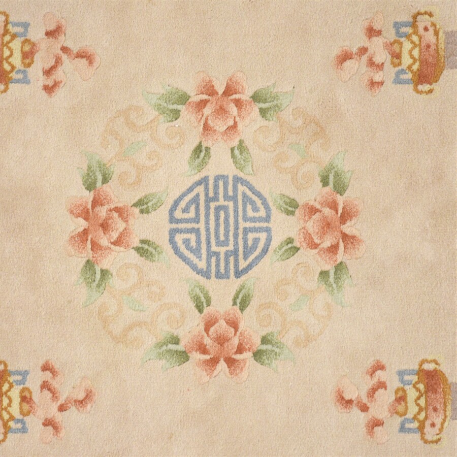 Tapis tien tsin à décors de fleurs et motifs asiatiques sur fond beige, Chine, 205 x 124 cm (avec certificat).