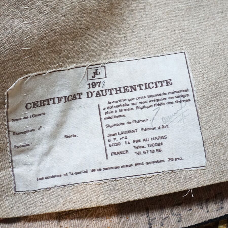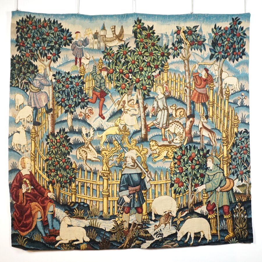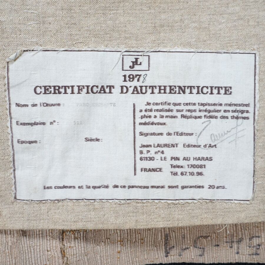Tapisserie "Parc enchanté", réplique d'un thème médiéval, en laine polychrome, étiquette au dos de Jean LAURENT éditeur, 152 x 143 cm.