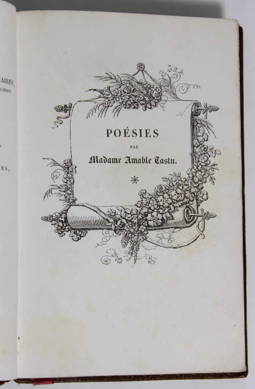 TASTU (Amable) - Poésies - Paris ; Ambroise Dupont et Cie, Baudoin Frères, ... , 1826 - 1 volume In-12° - Titre dans un encadrement gravé, petites vignettes gravées in texte - Reliure de l'époque veau fauve - Plats encadrés de motifs frappés à froid et de filets dorés avec fleurons aux angles - Monogramme (A A) doré et couronné aux centres - Joli dos à nerfs orné - Pièce de titre maroquin vert - Dentelle intérieure à froid - Tranches mouchetées - Bel exemplaire en édition originale (Vicaire, VII, 760) - On y joint : Lettre autographe signée de l'auteure datée du 11 mai [18]69 au monogramme A T frappé à froid dans laquelle elle remercie M. Méry pour les vers qu'il lui a adressé ainsi qu'à son fils - Sur 3 pages In-18° pliées à l'encre noire bien lisible.