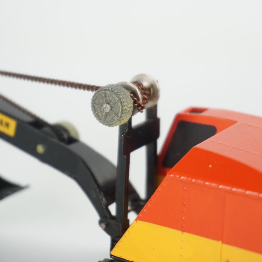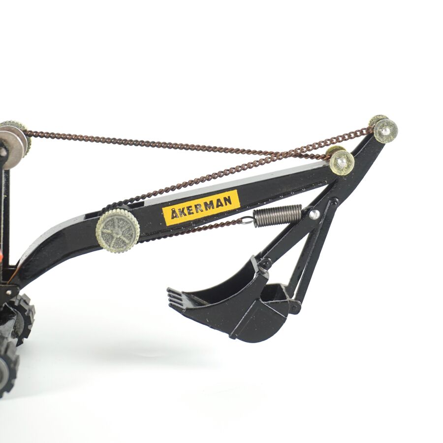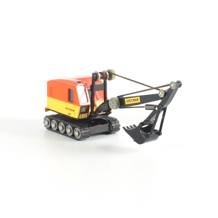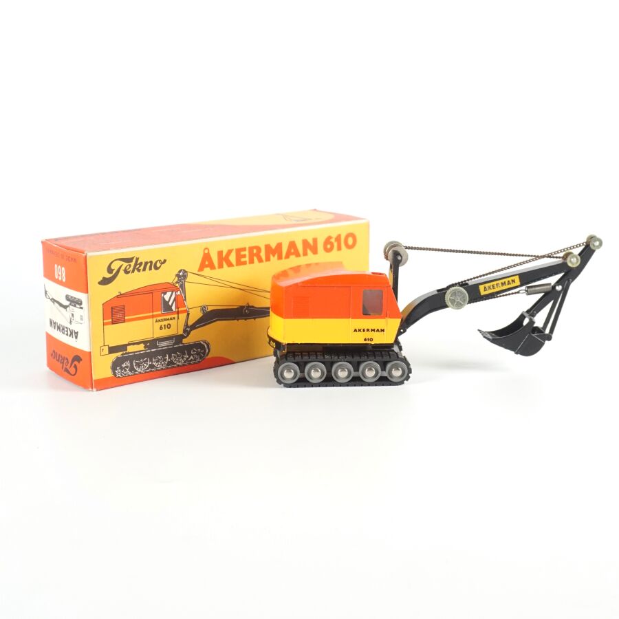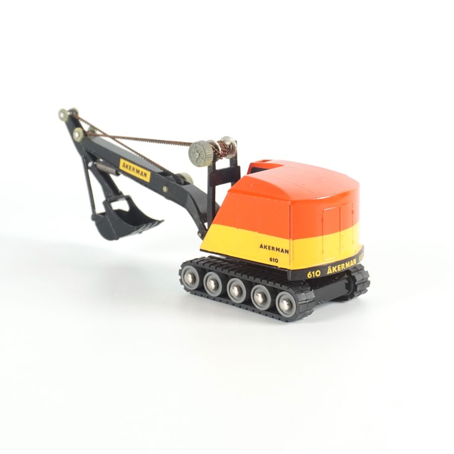 TEKNO (Danemark) : Akerman, grue sur chenille, réf. 610, couleur orange et rouge, avec sa pelle, dans sa boîte d'origine (quelques usures à la boîte, infimes traces, bel état).