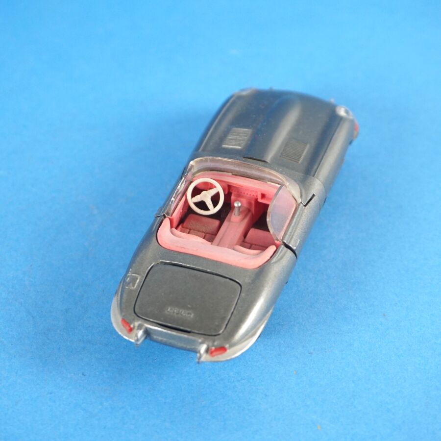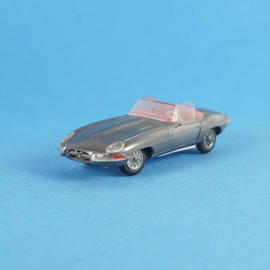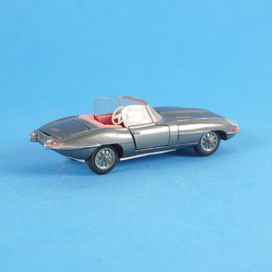 TEKNO (Danemark) : Jaguar "E", réf. 926, couleur grise, intérieur rose, avec portes, coffre et capot ouvrants, dans sa boîte d'origine (quelques usures à la boîte, moteur rongé, infimes écaillures).