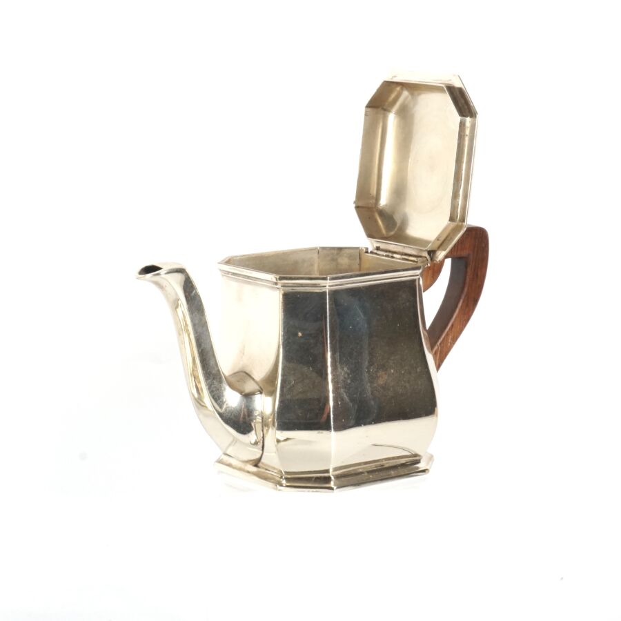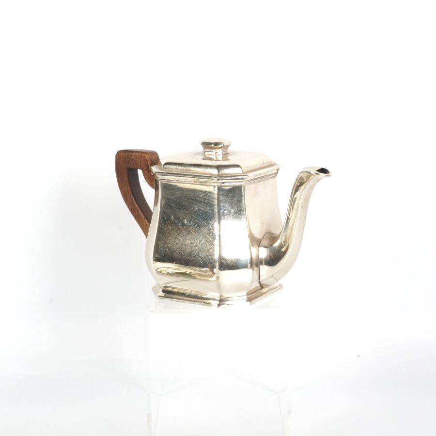 TETARD FRERES : Service à thé-café en argent, poinçon Minerve 1er titre, décor à pans coupés et filets de style Art Déco, anse en bois, comprenant un plateau octogonal, deux verseuses, un pot à lait et un sucrier, Dim. Plateau : 34.5 x 27.7 cm. H. Verseuses : 11 cm et 14 cm. H. Pot à lait : 5.5 cm. H. Sucrier : 8.5 cm. Poids brut : 2 120 g environ.